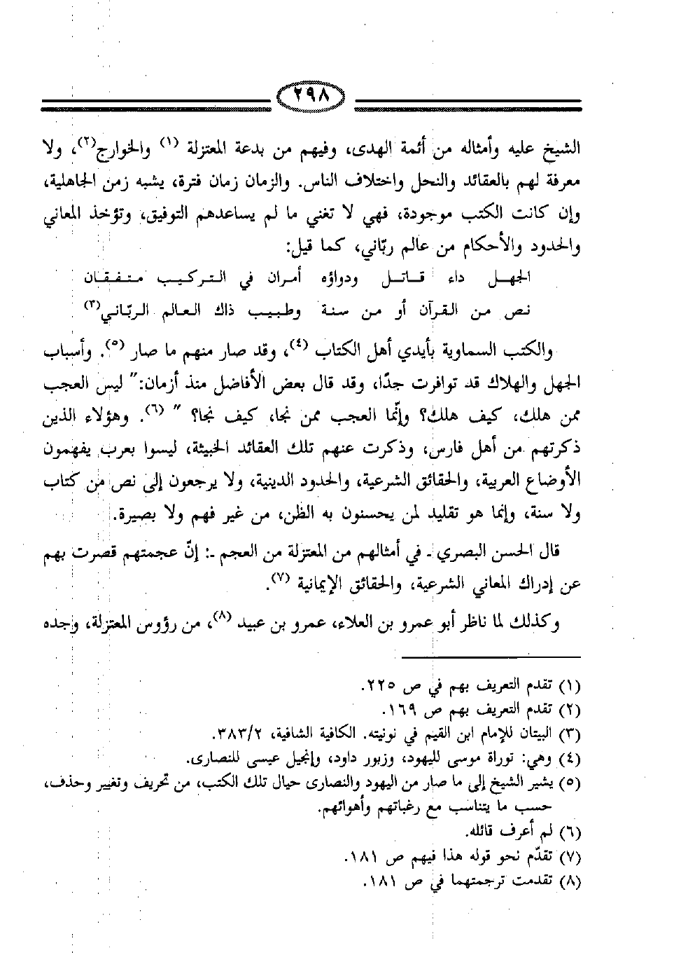 والكتب السماوية بأيدي أهل الكتاب (4) ، وقد صار منهم ما صار (5) ،وأساب الجهل والهلاك قد توافرت جداً، وقد قال بعض الأفاضل منذ أزمان: "ليس العجب ممن هلك كيف هلك؟ ولكن العجب ممن نجا كيف نجا؟ " (6) . وهؤلاء الذين ذكرتهم من أهل فارس، وذكرت عنهم تلك العقائد الخبيثة، ليسوا بعرب يفهمون الأوضاع العربية، والحقائق الشرعية، والحدود الدينية، ولا يرجعون إلى نص من كتاب ولا سن، وإنما هو تقليد لم يحسنون به الظن، من غير فهم ولا بصيرة.