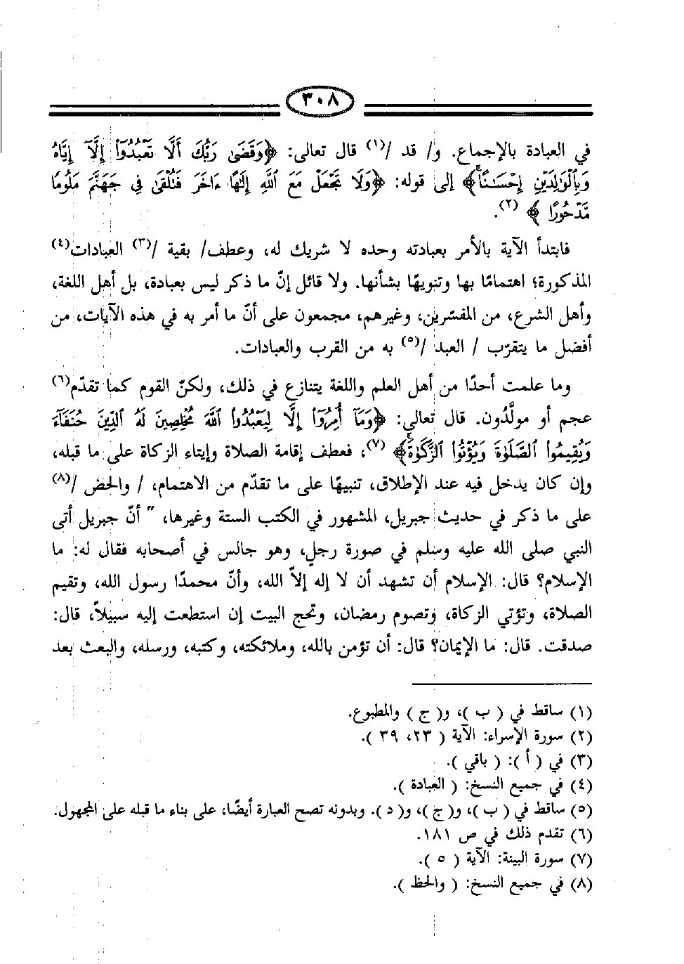 وما علمت أحداً من أهل العلم واللغة يتنازع في ذلك، ولكن القوم كما تقدم6 عجم أو مولدون. قال تعالى: {وَمَا أُمِرُوا إِلَّا لِيَعْبُدُوا اللَّهَ مُخْلِصِينَ لَهُ الدِّينَ حُنَفَاءَ وَيُقِيمُوا الصَّلاةَ وَيُؤْتُوا الزَّكَاةَ} 7، فعطف إقامة الصلاة وإيتاء الزكاة على ما قبله، وإن كان يدخل فيه عند الإطلاق، تنبيهاً على ما تقدم من الاهتمام، /والحض/8 على ما ذكر في حديث جبريل، المشهور في الكتب الستة وغيرها، " أن جبريل أتى النبي صلى الله عليه وسلم في صورة رجل، وهو جالس في أصحابه فقال له: ما الإسلام؟ قال: الإسلام أن تشهد أن لا إله إلا الله، وأن محمداً رسول الله، وتقيم الصلاة، وتوتي الزكاة، وتصوم رمضان، وتحج البيت إن استطعت إليه سبيلاً، قال: صدقت. قال: ما الإيمان؟ قال: أن تؤمن بالله، وملائكته، وكتبه، ورسله، والبعث بعد