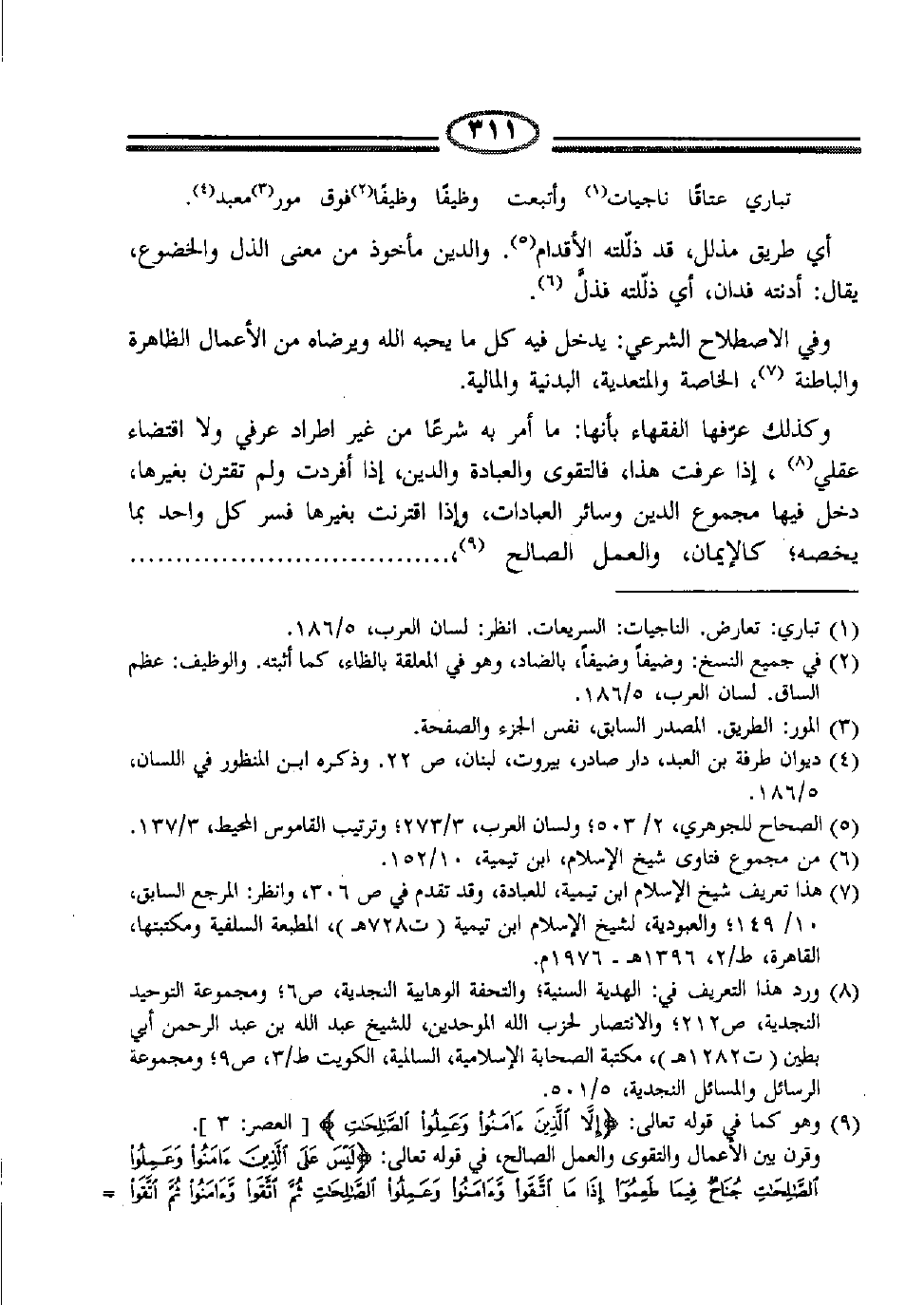 8 ورد هذا التعريف في: الهداية السنية؛ والتحفة الوهابية النجدية، ص6؛ ومجموعة التوحيد النجدي، ص212؛ والانتصار لحزب الله الموحدين، للشيخ عبد الله بن عبد الرحمن أبي بطين (ت 1282هـ) ، مكتبة الصحابة الإسلامية، السالمية، الكويت ط/3، ص9؛ ومجموعة الرسائل والمسائل النجدية، 5/501.