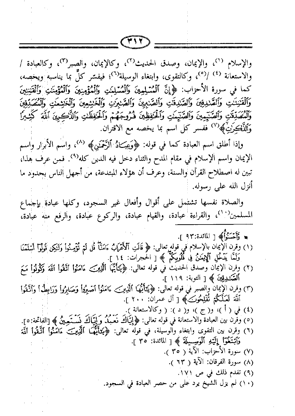 والإسلام1، والإيمان، وصدق الحديث2، وكالإيمان، والصبر3، وكالعبادة /والإستعانة4/5، وكالتقوى، وابتغاء الوسيلة6؛ فيفسر كل بما يناسبه ويخصه، كما في سورة الأحزاب: {إِنَّ الْمُسْلِمِينَ وَالْمُسْلِمَاتِ وَالْمُؤْمِنِينَ وَالْمُؤْمِنَاتِ وَالْقَانِتِينَ وَالْقَانِتَاتِ وَالصَّادِقِينَ وَالصَّادِقَاتِ وَالصَّابِرِينَ وَالصَّابِرَاتِ وَالْخَاشِعِينَ وَالْخَاشِعَاتِ وَالْمُتَصَدِّقِينَ وَالْمُتَصَدِّقَاتِ وَالصَّائِمِينَ وَالصَّائِمَاتِ وَالْحَافِظِينَ فُرُوجَهُمْ وَالْحَافِظَاتِ وَالذَّاكِرِينَ اللَّهَ كَثِيراً وَالذَّاكِرَاتِ} 7 فسر كل اسم بما يخصه مع الاقتران.