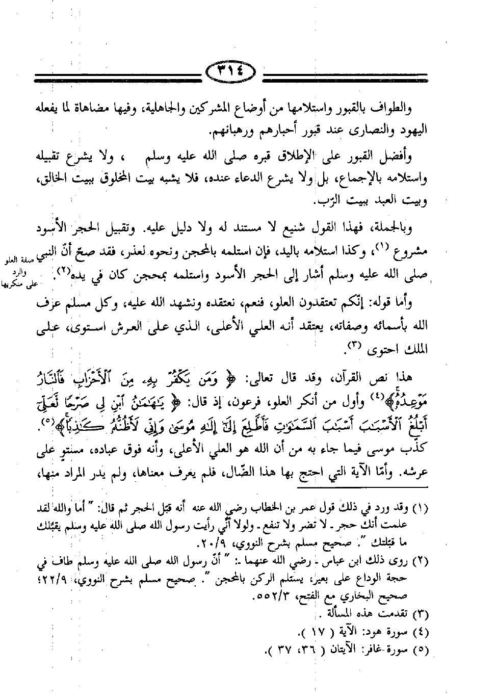 هذا نص القرآن، وقد قال تعالى: {وَمَنْ يَكْفُرْ بِهِ مِنَ الْأَحْزَابِ فَالنَّارُ مَوْعِدُهُ} 4 وأول من أنكر العلو فرعون، إذ قال: {وَقَالَ فِرْعَوْنُ يَا هَامَانُ ابْنِ لِي صَرْحاً لَعَلِّي أَبْلُغُ الْأَسْبَابَ أَسْبَابَ السَّمَاوَاتِ فَأَطَّلِعَ إِلَى إِلَهِ مُوسَى وَإِنِّي لَأَظُنُّهُ كَاذِباً} 5. كذب موسى فيما جاء به من أن الله هو العلي الأعلى، وأنه فوق عباده، مستو على عرشه. وأما الآية التي احتج بها هذا الضال، فلم يعرف معناها، ولم يدر المراد منها،