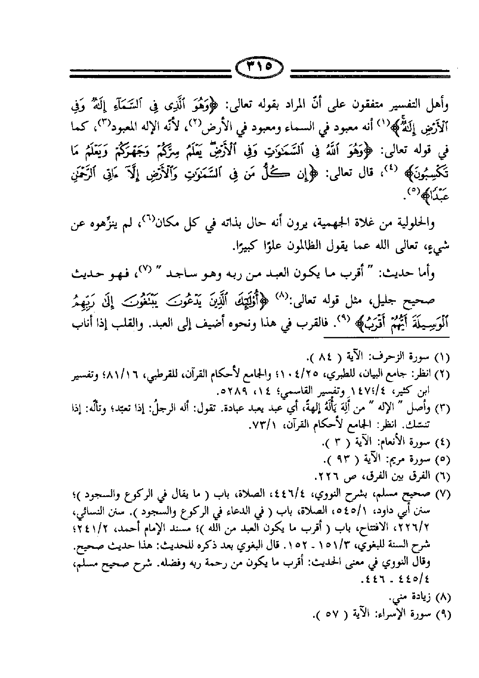 وأهل التفسير متفقون على أن المراد بقوله تعالى: {وَهُوَ الَّذِي فِي السَّمَاءِ إِلَهٌ وَفِي الْأَرْضِ إِلَهٌ} 1 أنه معبود في السماء ومعبود في الأرض2 لأنه الإله المعبود3، كما في قوله تعالى: {وَهُوَ اللَّهُ فِي السَّمَاوَاتِ وَفِي الْأَرْضِ يَعْلَمُ سِرَّكُمْ وَجَهْرَكُمْ وَيَعْلَمُ مَا تَكْسِبُونَ} 4، قال تعالى: {إِنْ كُلُّ مَنْ فِي السَّمَاوَاتِ وَالْأَرْضِ إِلَّا آتِي الرَّحْمَنِ عَبْداً} 5.