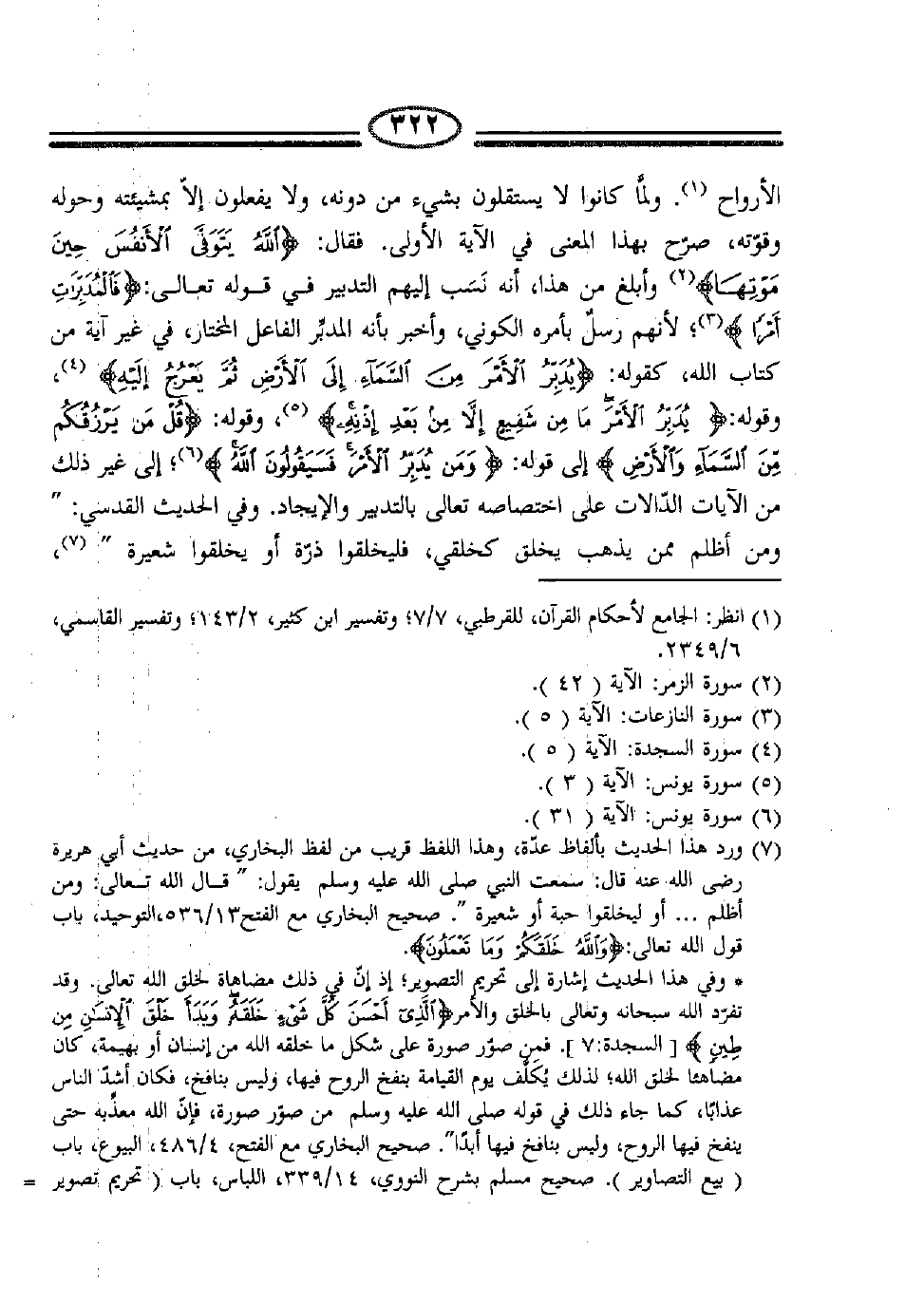الأرواح1. ولما كانوا لا يستقلون بشيء من دونه، ولا يفعلون إلا بمشيئته وحوله وقوته، صرح بهذا المعنى في الآية الأولى. فقال: {اللَّهُ يَتَوَفَّى الْأَنْفُسَ حِينَ مَوْتِهَا} 2 وأبلغ من هذا، أنه نسب إليهم التدبير في قوله تعالى: {فَالْمُدَبِّرَاتِ أَمْراً} 3؛ لأنهم رسل بأمره الكوني، وأخبر بأنه المدبر الفاعل المختار، في غير آية من كتاب الله، كقوله: {يُدَبِّرُ الْأَمْرَ مِنَ السَّمَاءِ إِلَى الْأَرْضِ ثُمَّ يَعْرُجُ إِلَيْهِ} 4، وقوله: {يُدَبِّرُ الْأَمْرَ مَا مِنْ شَفِيعٍ إِلَّا مِنْ بَعْدِ إِذْنِهِ} 5، إلى قوله: {وَمَنْ يُدَبِّرُ الْأَمْرَ فَسَيَقُولُونَ اللَّهُ} 6؛ إلى غير ذلك من الآيات الدالات على اختصاصه تعالى بالتدبير والإيجاد. وفي الحديث القدسي: " ومن أظلم ممن يذهب يخلق كخلقي، فليخلقوا ذرة أو يخلقوا شعيرة " 7،