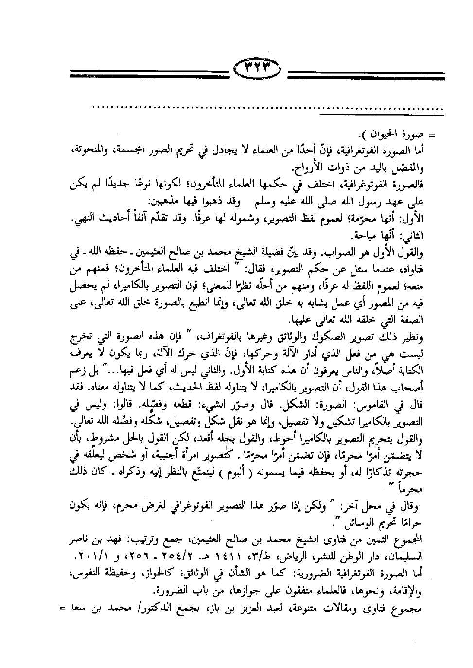 المجموع الثمين من فتاوى الشيخ محمد بن صالح العثيمين، جمع وترتيب: فهد بن ناصر السليمان، دار الوطن للنشر، الرياض، ط/ 3، 1411هـ. 2/ 254-256، و 1/ 201. أما الصورة الفوتغرافية الضرورية: كما هو الشأن في الوثائق؛ كالجواز، وحفيظة النفوس، والإقامة، ونحوها، فالعلماء متفقون على جوازها، من باب الضروة.