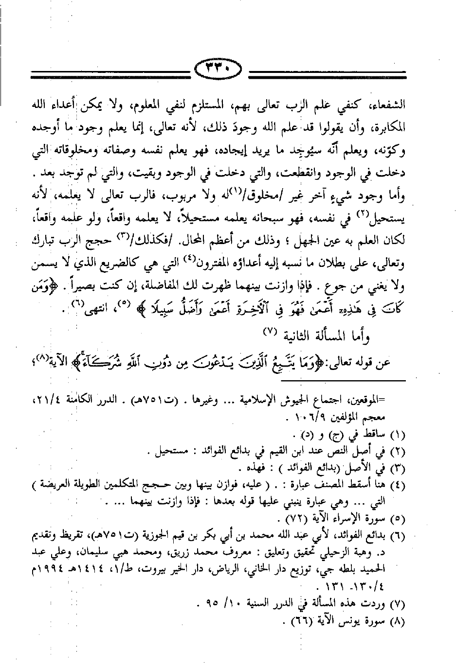 6 بدائع الفوائد، لأبي عبد الله محمد بن أبي بكر بن قيم الجوزية (ت 751هـ) ، تقريظ وتقديم د. وهبة الزحيلي تحقيق وتعليق: معروف محمد هبي سليمان، وعلي عبد الحميد بلطه جي، توزيع دار الخاني، الرياض، دار الخير بيروت، ط/1، 1414هـ 1994م 4/130- 131.