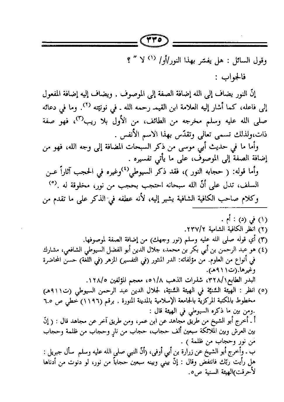 إنّ النور يضاف إلى الله إضافة الصفة إلى الموصوف، ويضاف إليه إضافة المفعول إلى فاعله، كما أشار إليه العلامة ابن القيم –رحمه الله- في نونيته2. وما في دعائه صلى الله عليه وسلم مخرجه من الطائف، من الأول بلا ريب3، فهو صفة ذات، ولذلك تسمى تعالى وتقدس بهذا الاسم الأنفس.
