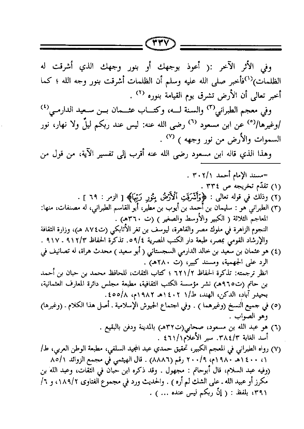 وفي الأثر الآخر: " أعوذ بوجهك أو بنور وجهك الذي أشرقت له الظلمات "1 فأخبر صلى الله عليه وسلم أن الظلمات أشرقت بنور وجه الله؛ كما أخبر تعالى أن الأرض تشرق يوم القيامة بنوره2.