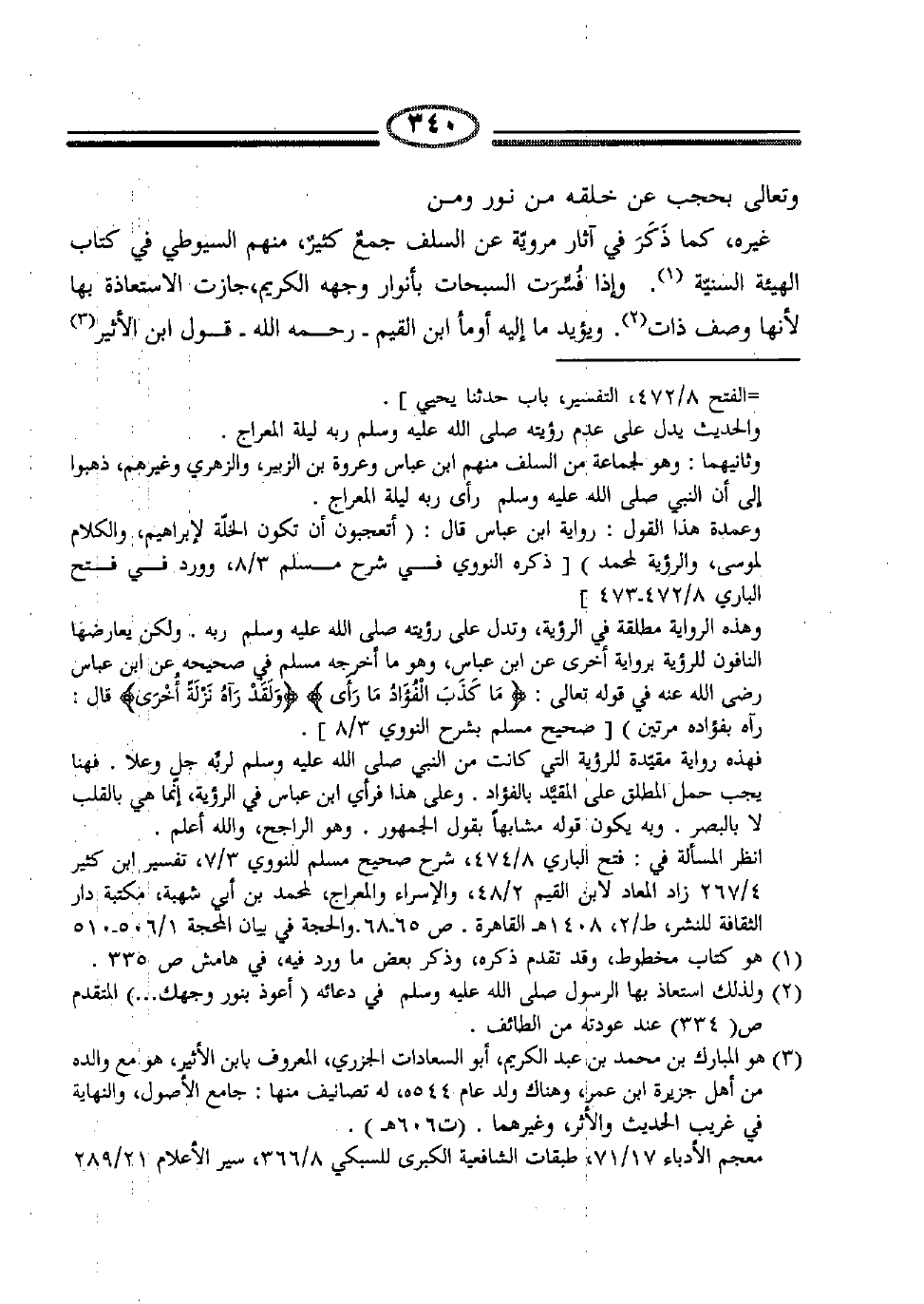 وتعالى بحجب عن خلقه من نور ومن غيره، كما ذَكَرَ في آثار مرويّة عن السلف جمعٌ كثيرٌ، منهم السيوطي في كتاب الهيئة السنيّة1. وإذا فُسِّرَت السبحات بأنوار وجهه الكريم، جازت الاستعاذة بها لأنها وصف ذات2. ويؤيد ما أومأ إليه ابن القيم –رحمه الله- قول ابن الأثير3
