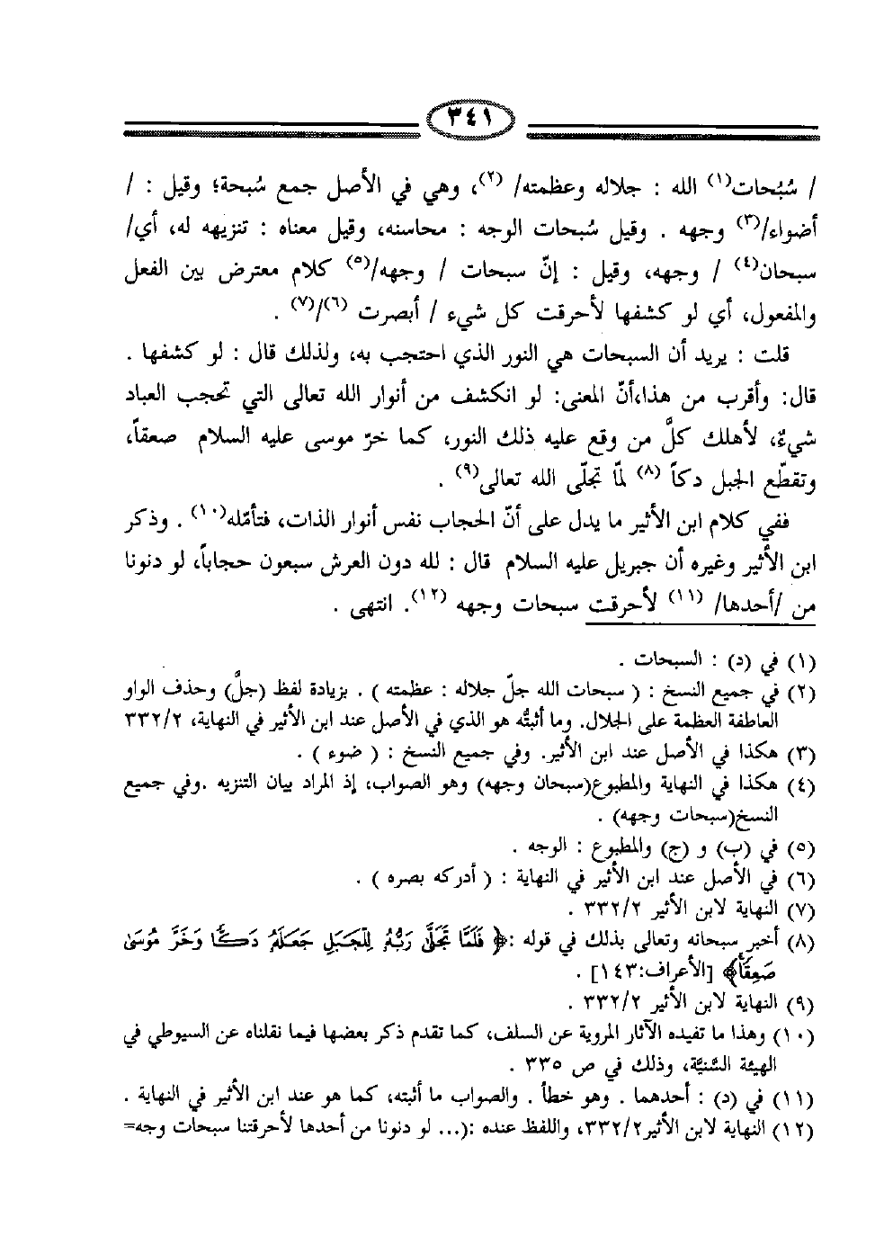 12 النهاية لابن الأثير 2/332، واللفظ عنده: ( ... لو دنونا من أحدها لأحرقنا سبحات وجه ربنا ".وورد هذا الأثر في الهيئة السَّنيَّة للسيوطي ص5. وقد تقدم ذكره في ص335.