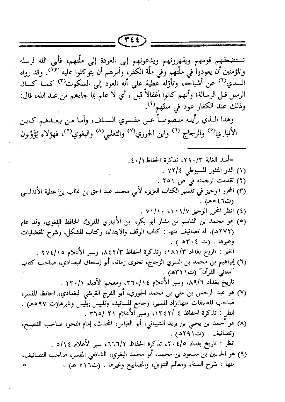 وهذا الذي رأيته منصوصاً عن أئمة السلف، وأما من بعدهم كابن الأنباري5 والزجاج6 وابن الجوزي7 والثعلبي8 والبغوي9، فهؤلاء يُؤَّوِّلون