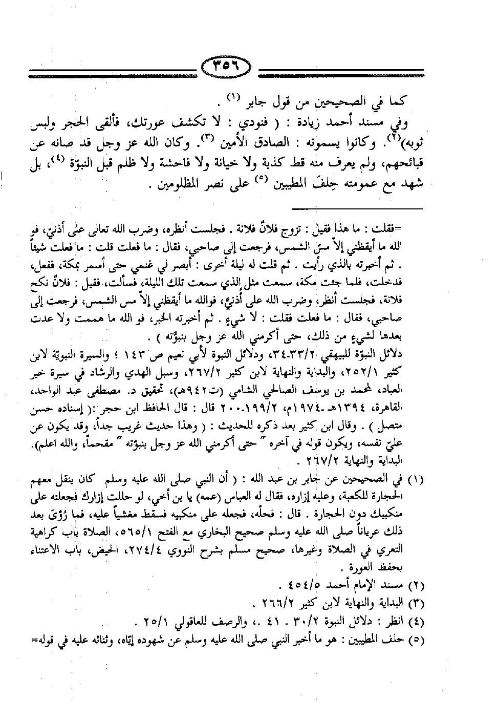 1 في الصحيحين عن جابر بن عبد الله: (أن النبي صلى الله عليه وسلم كان ينقل معهم الحجارة للكعبة، وعليه إزاره، فقال له العباس (عمه) يابن أخي، لو حللت إزارك فجعلته على منكبيك دون الحجارة. قال: فحلّه، فجعله على منكبيه فسقط مغشياً عليه، فما رؤي بعد ذلك عرياناً صلى الله عليه وسلم، صحيح البخاري مع الفتح 1/565، الصلاة باب كراهية التعري في الصلاة وغيرها، صحيح مسلم بشرح النووي 4/274، باب الاعتناء بحفظ العورة.