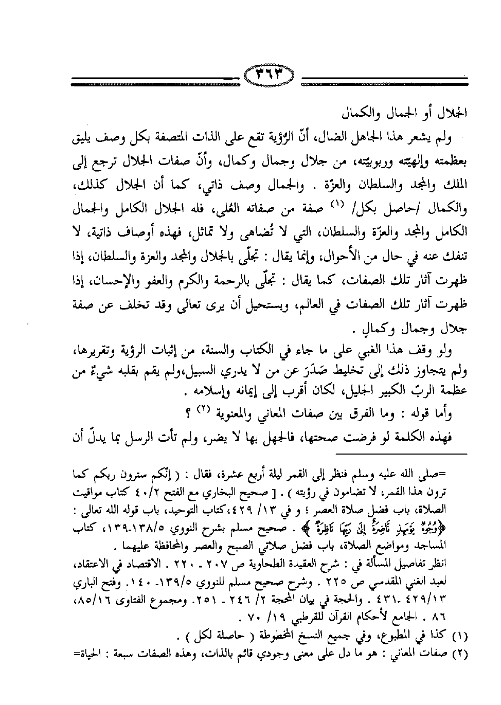 ولم يشعر هذا الجاهل الضال، أنّ الرُّؤية تقع على الذات المتصفة بكل وصف، يليق بعظمته، وإلهيّته، وربوبيّته، من جلال، وجمال، وكمال؛ وأن صفات الجلال ترجع إلى الملك، والمجد، والسلطان، والعزة. والجمال وصف ذاتي، كما أن الجلال كذلك، والكمال /حاصل بكل/1 صفة من صفاته العُلى، فله الجلال الكامل، والجمال الكامل، والمجد، والعزة والسلطان التي لا تُضاهى ولا تماثل؛ فهذه أوصاف ذاتية، لا تنفك عنه في حال من الأحوال، وإنما يقال: تجلّى بالجلال، والمجد، والعزة، والسلطان، إذا ظهرت آثار تلك الصفات؛ كما يقال: تجلّى بالرحمة، والكرم، والعفو، والإحسان، إذا ظهرت آثار تلك الصفات في العالم؛ ويستحيل أن يرى تعالى، وقد تخلف عن صفة جلال وجمال وكمال.