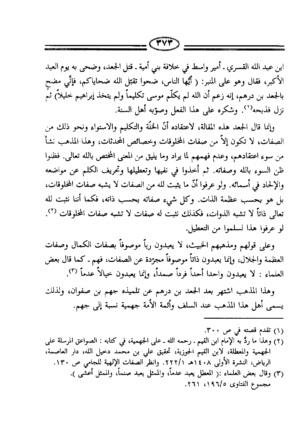 وإنما قال الجعد هذه المقالة، لاعتقاده أن الخلّة، والتكليم، والاستواء، ونحو ذلك، من الصفات، لا تكون إلاّ من صفات المخلوقات، وخصائص المحدثات، وهذا المذهب نشأ من سوء اعتقادهم، وعدم فهمهم لما يراد، وما يليق من المعنى المختص بالله تعالى، فظنوا ظن السوء بالله وصفاته، ثم أخذوا في نفيها، وتعطيلها، وتحريف الكلم عن مواضعه، والإِلحاد في أسمائه، ولو عرفوا أنّ ما يثبت لله من الصفات، لا يشبه صفات المخلوقات، بل هو بحسب عظمة الذات، وكل شيء صفاته بحسب ذاته، فكما أننا نثبت لله تعالى ذاتاً لا تشبه الذوات، فكذلك نثبت له صفات، لا تشبه صفات المخلوقات2؛ لو عرفوا هذا، لسلموا من التعطيل.