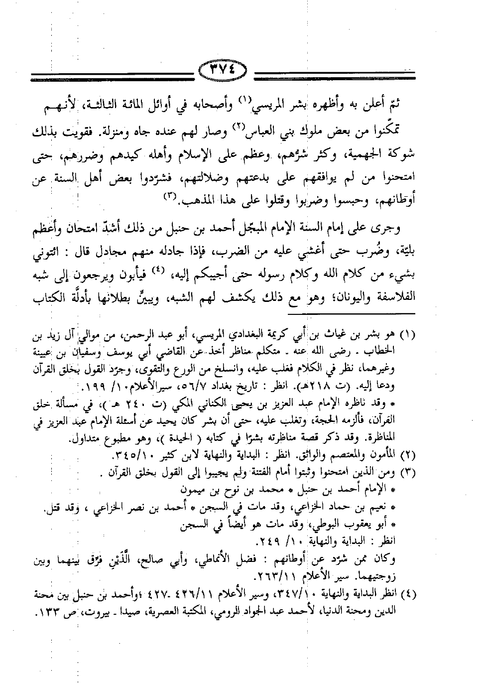 4 انظر البداية والنهاية 10/347، وسير الأعلام 11/426-427؛ وأحمد بن حنبل بين محنة الدين ومحنة الدنيا، لأحمد عبد الجواد الرومي، المكتبة العصرية، صيدا- بيروت، ص133.