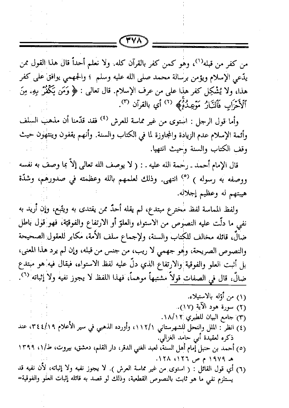 6 أي قول القائل: (استوى من غير مماسة العرش) ؛ لا يجوز نفيه ولا إثباته، لأن نفيه قد يستلزم نفي ما هو ثابت بالنصوص القطعية، وذلك لو قصد به قائله إثبات العلو والفوقية الذي دل عليه لفظ الاستواء، وكذلك إثباته باطل لفظاً، إذ إنه لم يرد في السنة المطهرة، ولا في أقول السلف الصالح، فهو لفظ مبتدع.