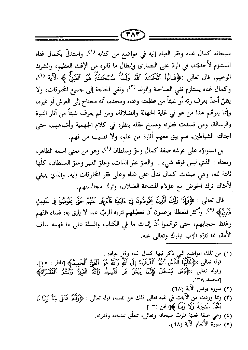 سبحانه كمال غناه، وفقر عباده إليه، في مواضع من كتابه1، واستدّل بكمال غناه، المستلزم لأحديّته، في الردّ على النصارى، وإبطال ما قالوه من الإِفك العظيم، والشرك الوخيم، قال تعالى: {قَالُوا اتَّخَذَ اللَّهُ وَلَداً سُبْحَانَهُ هُوَ الْغَنِيُّ} 2 الآية؛ وكمال غناه يستلزم نفي الصحبة، والولد3، ونفي الحاجة إلى جميع المخلوقات، ولا يظنّ أحدٌ يعرف ربّه، أو شيئاً من عظمته وغناه ومجده، أنه محتاج إلى العرش، أو غيره؛ وإنّما يتوّهم هذا من هو في غاية الجهالة والضلالة، ومن لم يعرف شيئاً من آثار النبوة والرسالة؛ ومن فسدت فطرته، ومسخ عقله، بنظره في كلام الجهمية، وأشباههم، حتى اجتالته الشياطين، فلم يبق معه أثارة من علم، ولا نصيب من فهم.
