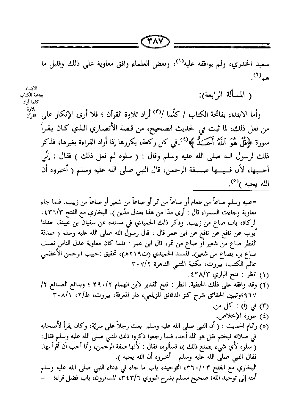 وأما الابتداء بفاتحة الكتاب /كلّما/3 أراد تلاوة القرآن؛ فلا أرى الإنكار على من فعل ذلك، لما ثبت في الحديث الصحيح، من قصة الأنصاري الذي كان يقرأ سورة {قُلْ هُوَ اللَّهُ أَحَدٌ} 4، في كل ركعة، يكررها إذا أراد القراءة بغيرها، فذكر ذلك لرسول الله صلى الله عليه وسلم وقال: "سلوه لم فعل ذلك" فقال: إنِّي أحبها، لأن فيها صفة الرحمن، قال النبي صلى الله عليه وسلم: "أخبروه أن الله يحبه" 5.