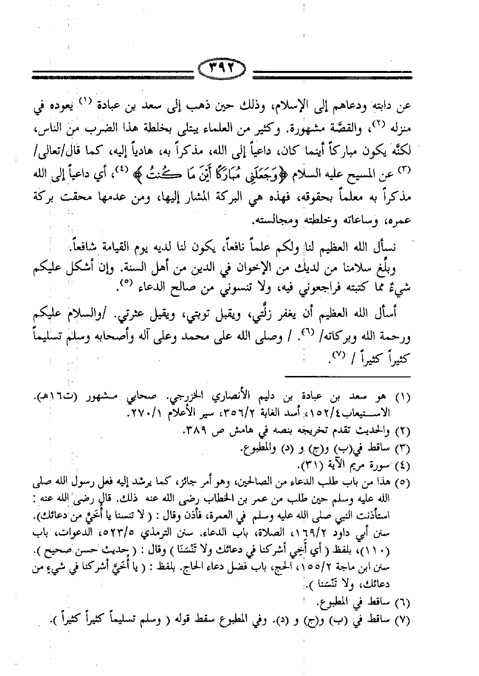 وبلِّغ سلامنا من لديك من الإخوان في الدين من أهل السنة، وإن أشكل عليكم شيء مما كتبته فراجعوني فيه، ولا تنسوني من صالح الدعاء5.