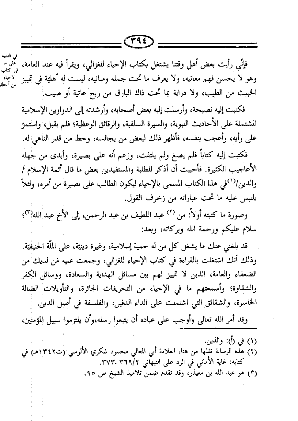 فكتبت إليه كتاباً، فلم يصغ، ولم يلتفت، وزعم أنه على بصيرة؛ وأبدى من هـ، جهله الأعاجيب الكثيرة؛ فأحببت أن أذكر للطلبة، والمستفيدين، بعض ما قاله أئمة الإسلام /والدين/1، في هذا الكتاب، المسمى بالإحياء ليكون الطالب، على بصيرة من أمره؛ ولئلاّ يلتبس عليه ما تحت عباراته، من زخرف القول.