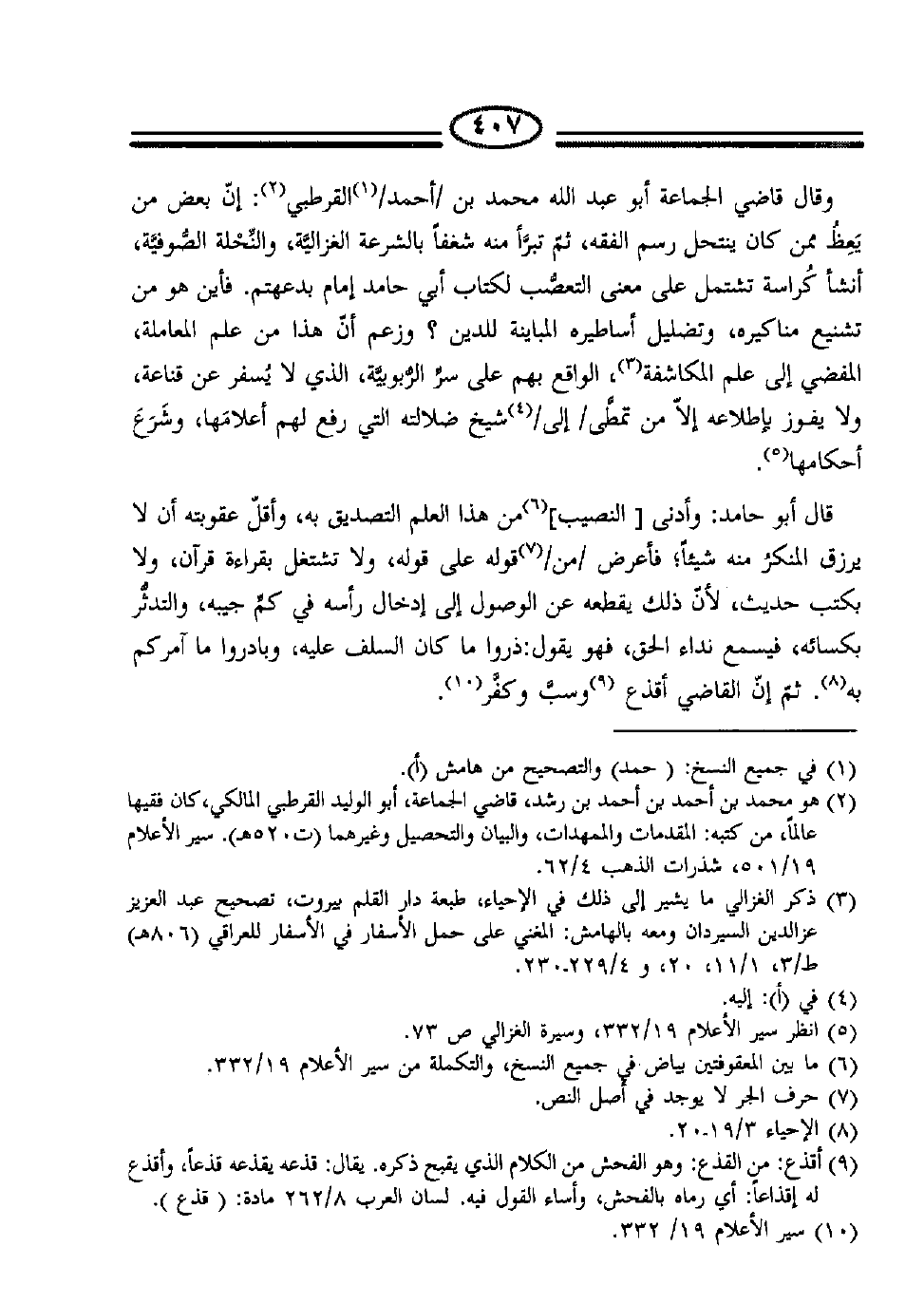 وقال قاضي الجماعة أبو عبد الله بن /أحمد/1 القرطبي2: إنّ بعض من يَعِظُ، ممن كان ينتحل رسم الفقه، ثمّ تبرّأ منه شغفاً بالشريعة الغزاليَّة، والنِّحلة الصُّوفَّية، أنشأ كُراسة تشتمل على معنى التعصب، لكتاب أبي حامد، إمام بدعتهم؛ فأين هو من تشنيع مناكيره، وتضليل أساطيره المباينة للدين؟ وزعم أنّ هذا من علم المعاملة، المفضي إلى علم المكاشفة3، الواقع بهم على سرِّ الرُّبوبيّة، الذي لا يُسفر عن قناعه، ولا يفوز بإطلاعه، إلاّ من تمطَّى /إلى/4 شيخ ضلالته، التي رفع لهم أعلامَها، وشَرَعَ أحكامَها 5.