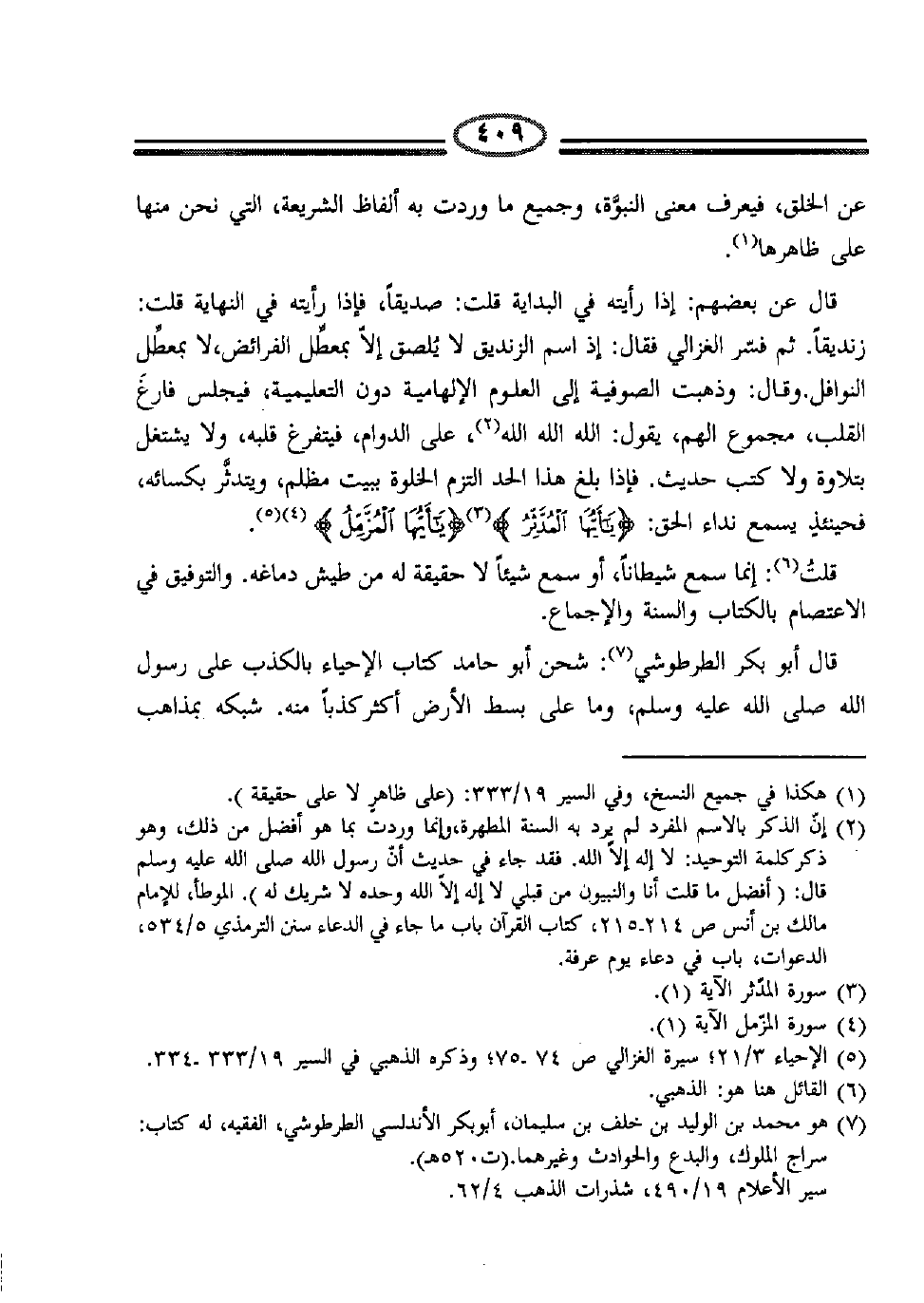 قال عن بعضهم: إذا رأيته في البداية قلت: صديقاً؛ فإذا رأيته في النهاية قلت: زنديقاً. ثم فسَّر الغزالي، فقال: إذا اسم الزنديق لا يُلصق إلاّ بمعطِّل الفرائض، لا بمعطِّل النوافل. وقال: وذهبت الصوفية إلى العلوم الإلهامية، دون التعليمية؛ فيجلس فارغَ القلب، مجموع الهم، فيقول: الله، الله، الله،2 على الدوام؛ فيتفرغ قلبه، ولا يشتغل بتلاوة، ولا كتب حديث؛ فإذا بلغ هذا الحد، التزم الخلوة ببيت مظلم، ويتدثَّر بكسائه، فحينئذٍ: يسمع نداء الحق: {يَا أَيُّهَا الْمُدَّثِّرُ} 3، {يَا أَيُّهَا الْمُزَّمِّلُ} 4.5