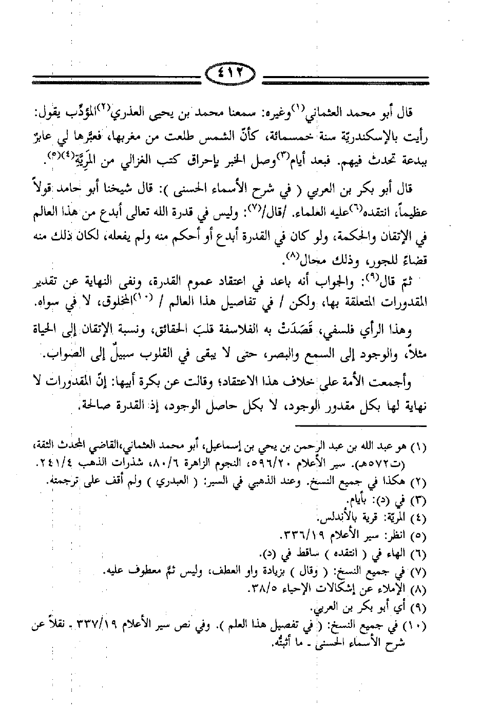 قال أبو بكر بن العربي، (في شرح الأسماء الحسنى) : قال شيخنا أبو حامد قولاً عظيماً، انتقده6 عليه العلماء، /قال/7: وليس في قدرة الله تعالى، أبدع من هذا العالم، في الإِتقان والحكمة، ولو كان في القدرة أبدع، أو أحكم منه، ولم يفعله، لكان ذلك منه قضاءً للجور، وذلك محال8.