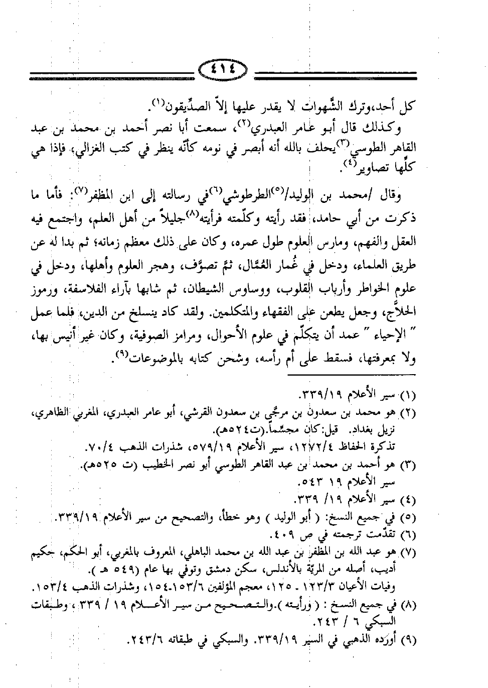 وكذلك قال أبو عامر العبدري2: سمعت أبا نصر، أحمد بن محمد بن عبد القاهر الطوسي3، يحلف بالله أنه أبصر في نومه، كأنّه ينظر في كتب الغزالي، فإذا هي كلِّها تصاوير4.