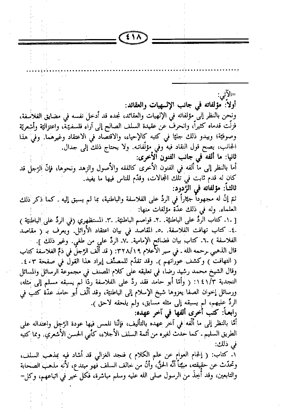 قال الذهبي –رحمه الله في سير الأعلام 19/328: (قد ألّف الرجل في ذم الفلاسفة، كتاب (التهافت) وكشف عوراتهم) . وقد تقدّم للمصنّف إيراد هذا القول في صفحة 403؛ وقال الشيخ محمد رشيد رضا، في تعليقه على كلام المصنف في مجموع الرسائل والمسائل النجدية 3/141: (وأما أبو حامد فقد ردّ على الفلاسفة ردّاً لم يسبقه مسلم إلى مثله، ورسائل إخوان الصفا يعزوها شيخ الإسلام إلى الباطنية، وقد أّلف أبو حامد عدّة كتب في الردّ عليهم، لم يسبق إلى مثله مسابق، ولم يلحقه لاحق) .