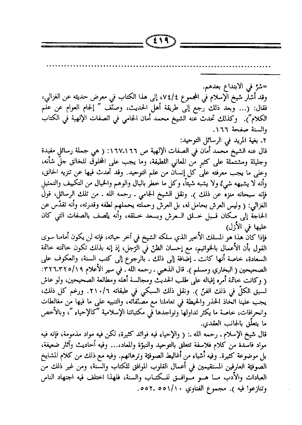 2-بغية المريد في الرسائل التوحيد: قال عنه الشيخ محمد أمان في الصفات الإلهية ص166-167: (هي جملة رسائل مفيدة وجليلة ومشتملة على كثير من المعاني اللطيفة، وما يجب على المخلوق للخالق جلّ شأنه، وعلى ما يجب معرفته على كل إنسان من علم التوحيد، وقد تحدث فيها عن تنزيه الخالق، وأنه لا يشبهه شيءٌ ولا يشبه شيئاً، وكل ما خطر بالبال والوهم والخيال من التكييف والتمثيل فإنه سبحانه منزه عن ذلك) . ونقل الشيخ الجامي –رحمه الله- من تلك الرسائل، قولَ الغزالي: (وليس العرش بحامل له، بل العرش وحملته يحملهم لطفه وقدرته، وأنّه تقدّس عن الحاجة إلى مكان قبل خلق العرش وبعد خلقه، وأنّه يتصف بالصفات التي كان عليها في الأزل) .