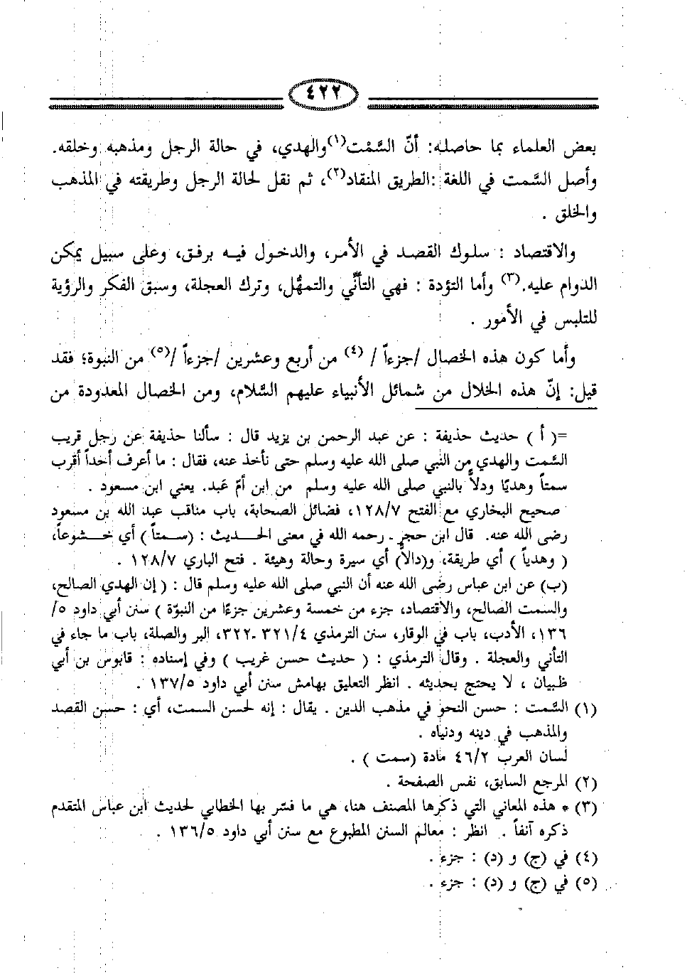 = (أ) حديث حذيفة: عن عبد الرحمن بن يزيد قال: سألنا حذيفة عن رجل قريب السَّمت والهدي من النبي صلى الله عليه وسلم حتى نأخذ عنه، فقال: ما أعرف أحداً أقرب سمتاً وهدياً من النبي صلى الله عليه وسلم من ابن أم عَبد. يعني ابن مسعود. صحيح البخاري مع الفتح 7/128، فضائل الصحابة، باب مناقب عبد الله بن مسعود رضي الله عنه، قال ابن حجر –رحمه الله- في معنى الحديث: (سمتاً) أي خشوعاً، (وهدياً) أي طريقة، (ودلالة) أي سيرة وحالة وهيئة. فتح الباري 7/128.