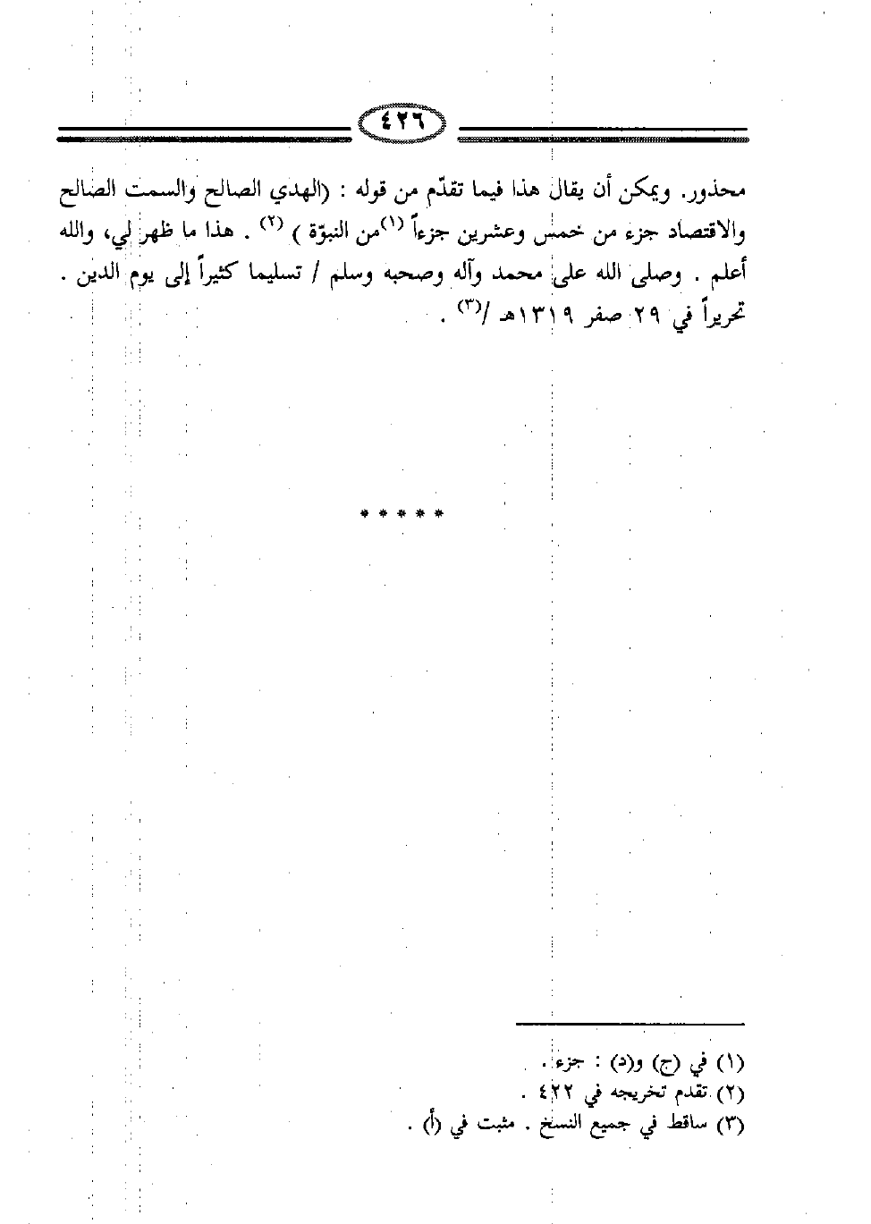 محذور. ويمكن أن يقال هذا فيما تقدم من قوله: "الهدي الصالح والسمت الصالح والاقتصاد جزء من خمس وعشرين جزءاً1 من النبوة" 2. هذا ما ظهر لي، والله أعلم، وصلى الله على محمد وآله وصحبه وسلم /تسليماً كثيراً إلى يوم الدين. تحريراً في 29 صفر 1319هـ/3.