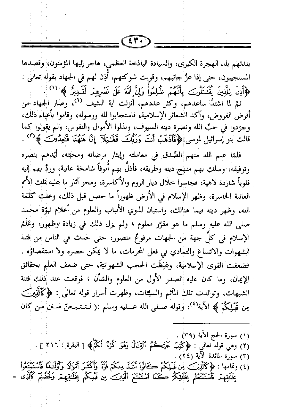 ثمّ لما اشتدّ ساعدهم، وكثر عددهم، أُنزلت آية السيف2، وصار الجهاد من أفرض الفروض، وآكد الشعائر الإسلامية، فاستجابوا لله ورسوله، وقاموا بأعباء ذلك، وجرّدوا في حب الله ونصرة دينه السيوف، وبذلوا الأموال والنفوس، ولم يقولوا كما قالت بنو إسرائيل لموسى: {فَاذْهَبْ أَنْتَ وَرَبُّكَ فَقَاتِلا إِنَّا هَاهُنَا قَاعِدُونَ} 3.