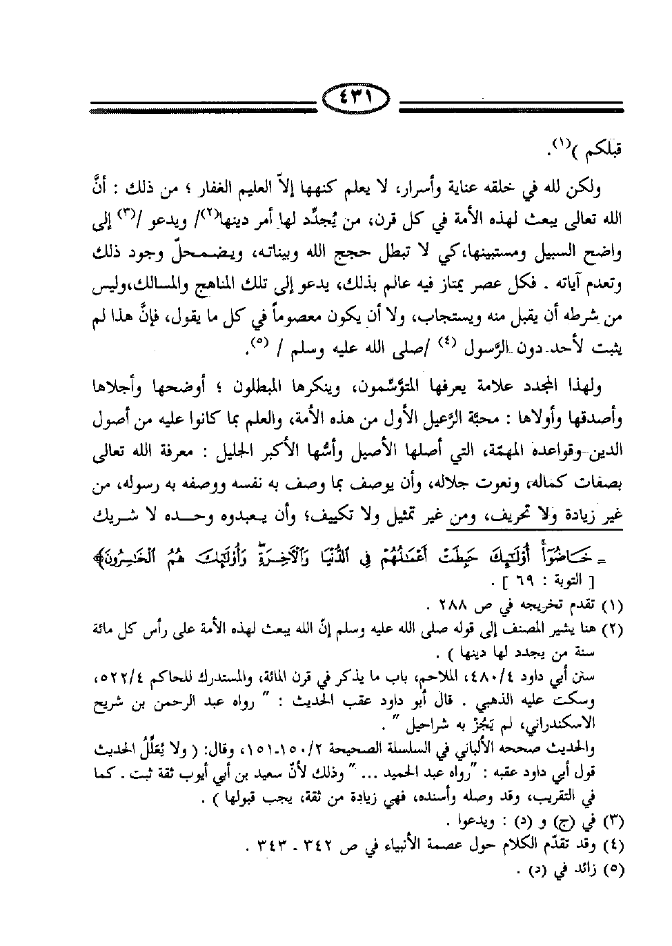 2 هنا يشير المصنف إلى قوله صلى الله عليه وسلم إنّ الله يبعث لهذه الأمة على رأس كل مائة سنة من يجدد لها دينها) . سنن أبي داود 4/480، الملاحم، باب ما يذكر في قرن المائة؛ والمستدرك للحاكم 4/522، وسكت عليه الذهبي، قال أبو داود عقب الحديث: "رواه عبد الرحمن بن شريح الاسكندري، لم يَجُزْ به شراحيل". والحديث صححه الألباني في السلسلة الصحيحة 2/150-151، وقال: (ولا يعلِّلُ الحديث قول أبي داود عقبه: "رواه عبد الحميد ... " وذلك لأن سعيد بن أبي أيوب ثقة ثبت –كما في التقريب، وقد وصله وأسنده، فهي زيادة من ثقة، يجب قبولها) .