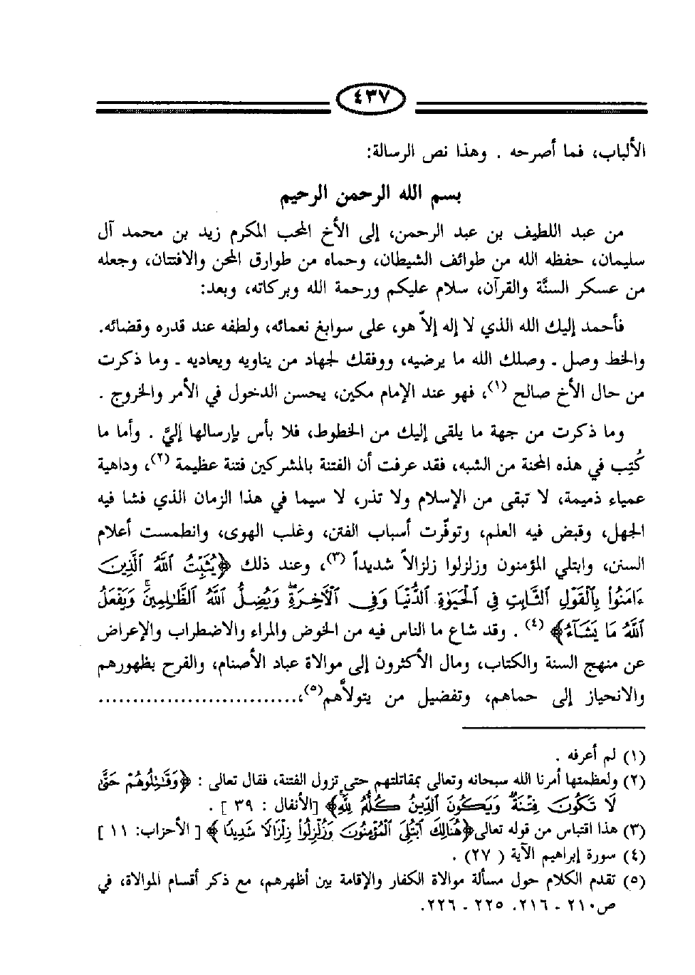 من عبد اللطيف بن عبد الرحمن، إلى الأخ المحب المكرم زيد بن محمد آل سليمان، حفظه الله من طوائف الشيطان، وحماه من طوارق المحن والافتتان، جعله من عسكر السنة والقرآن، سلام عليكم ورحمة الله وبركاته، وبعد: