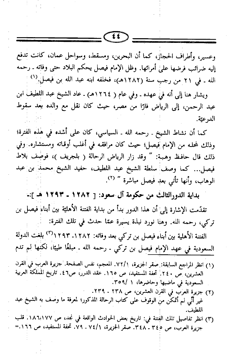 الفتنة الأهلية بين أبناء فيصل بن تركي بعد وفاته: 1282-1293هـ (3) بلغت الدولة السعودية في عهد الإمام فيصل بن تركي -رحمه الله- مبلغاً طيباً، لكنها لم تدم