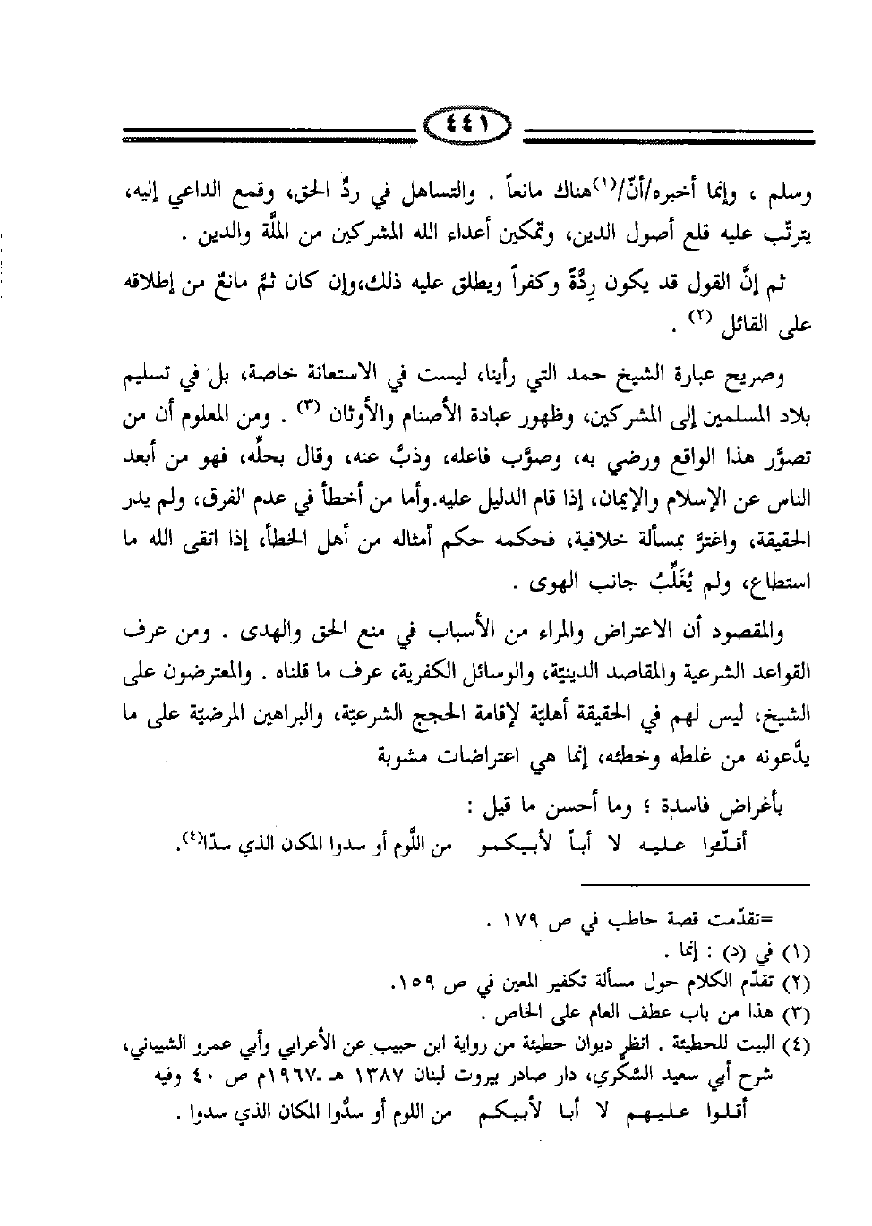 والمقصود أن الاعتراض والمراء من الأسباب في منع الحق والهدى. ومن عرف القواعد الشرعية والمقاصد الدينية، والوسائل الكفرية، عرف ما قلناه. والمعترضون على الشيخ، ليس لهم في الحقيقة أهلية لإقامة الحجج الشرعية، والبراهين المرضية على ما يدعونه من غلطه وخطئه، إنما هي اعتراضات مشوبة بأغراض فاسدة؛ وما أحسن ماقيل: