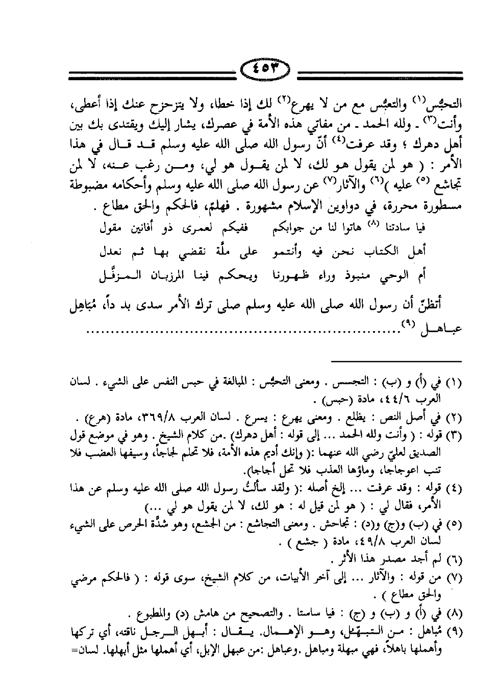 التحبس1 والتعبس مع من لا يهرع2 لك إذا خطا، ولا يتزحزح عنك إذا أعطى، وأنت3 -ولله الحمد- من مفاتي هذه الأمة في عصرك، يشار إليك ويقتدى بك بين ألأهل دهرك؛ وقد عرفت4 أن رسول الله صلى الله عليه وسلم قد قال في هذا الأمر: (هو لمن يقول هو لك، لا لمن يقول هو لي، ومن رغب عنه، لا لمن تجاشع5 عليه) 6 والآثار7 عن رسول الله صلى الله عليه وسلم وأحكامه مضبوطة مسطورة محررة، في دواوين الإسلام مشهورة. فهلم، فالحكم والحق مطاع.