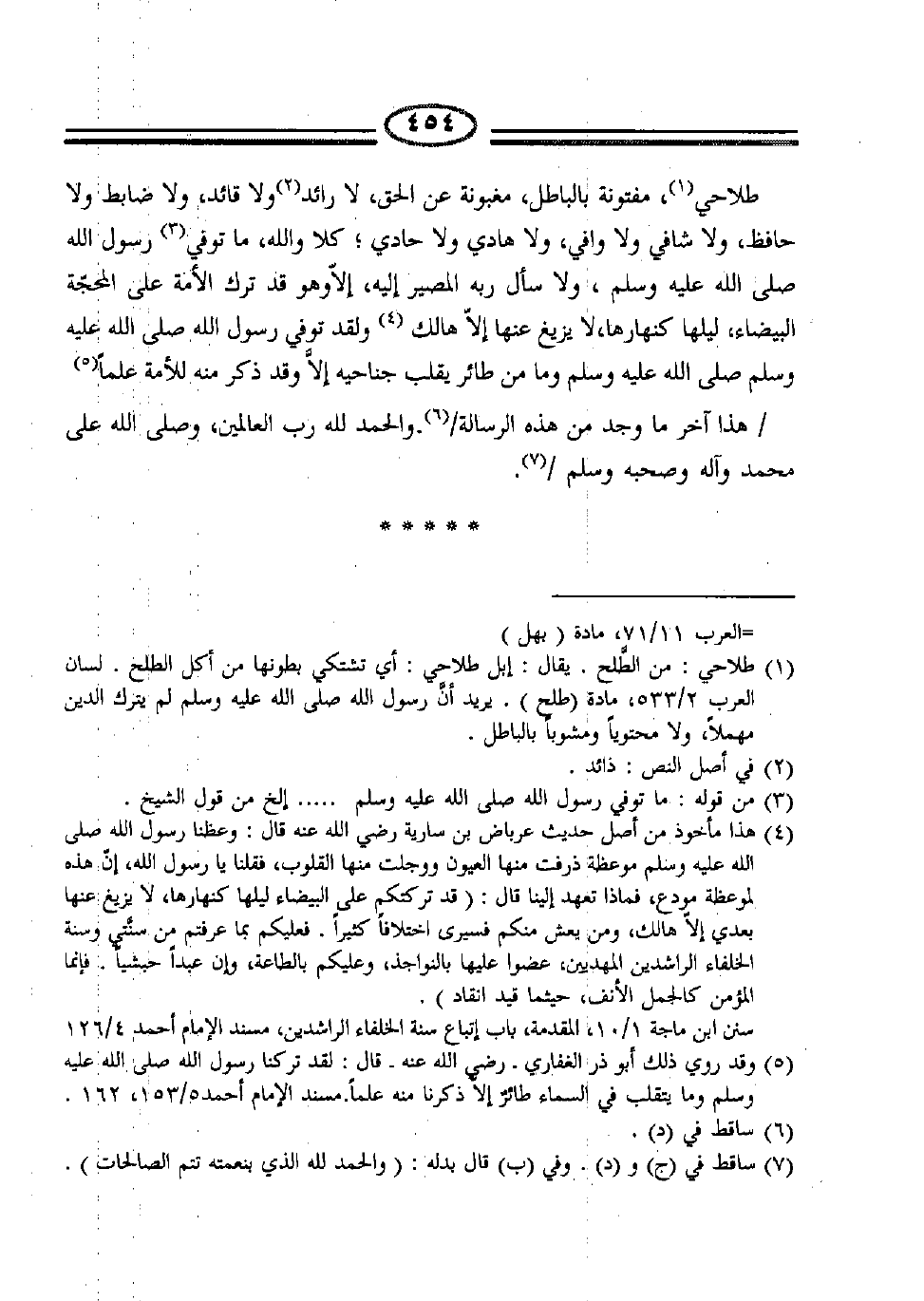 1 طلاحي: من الطلح. يقال: إبل طلاحي: أي تشتكي بطونها من أكل الطلح. لسان العرب 2/533، مادة (طلح) . يريد أن رسول الله صلى الله عليه وسلم لم يترك الدين مهملاً، ولا محتوياً ومشوباً بالباطل.