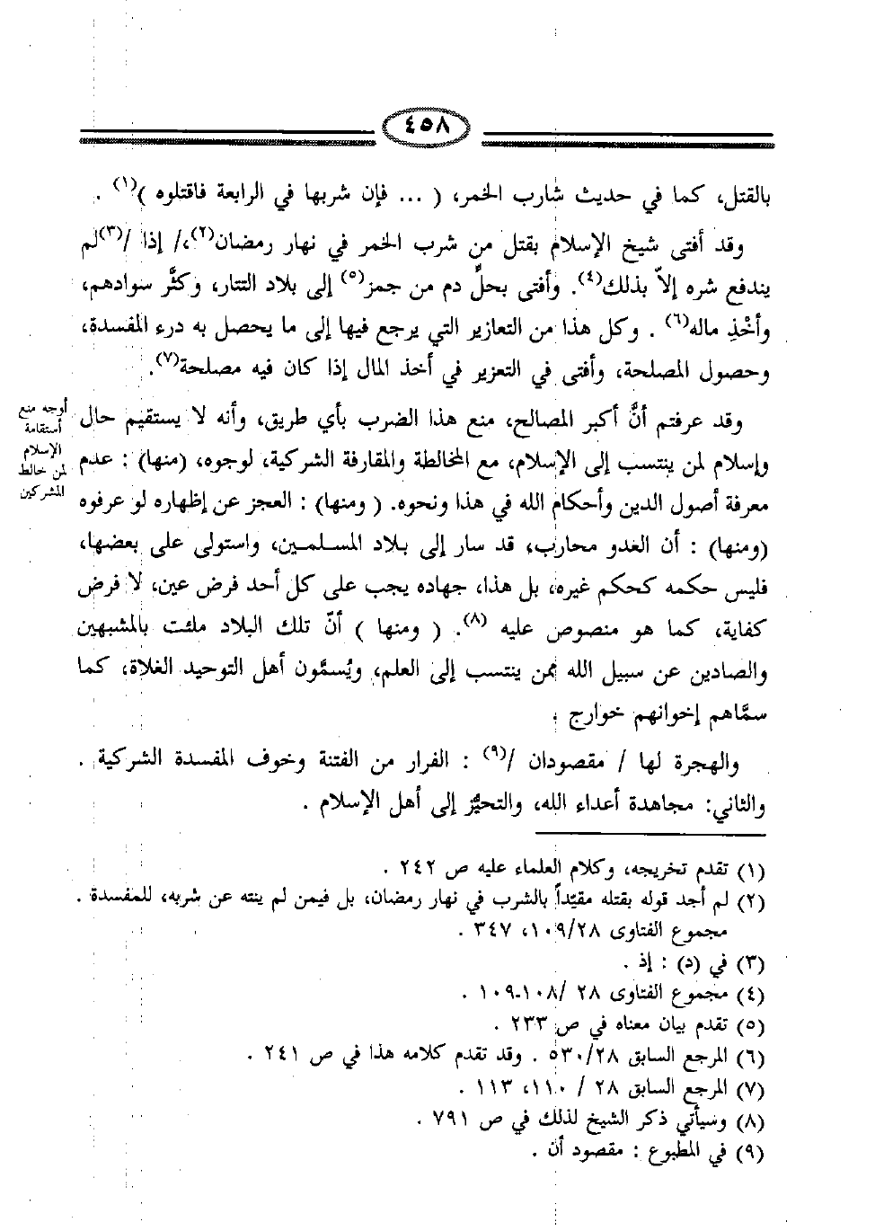 وقد عرفتم أن أكبر المصالح، منع هذا الضرب بأي طريق، وأنه لا يستقيم حال وإسلام لمن ينتسب إلى الإسلام، مع المخالطة والمقارفة الشركية، لوجوه، (منها) : عدم معرفة أصول الدين وأحكام الله في هذا ونحوه. (ومنها) : العجز عن إظهاره لو عرفوه (ومنها) : أن العدو محارب، قد سار إلى بلاد المسلمين، واستولى على بعضها، فليس حكمه كحكم غيره، بل هذا، جهاده يجب على كل أحد فيض عين، لا فرض كفاية، كما هو منصوص عليه8. (ومنها) أن تلك البلاد ملئت بالمشبهين والصادين عن سبيل الله ممن ينتسب إلى العلم، ويسمون أهل التوحيد الغلاة، كما سماهم إخوانهم خوارج.
