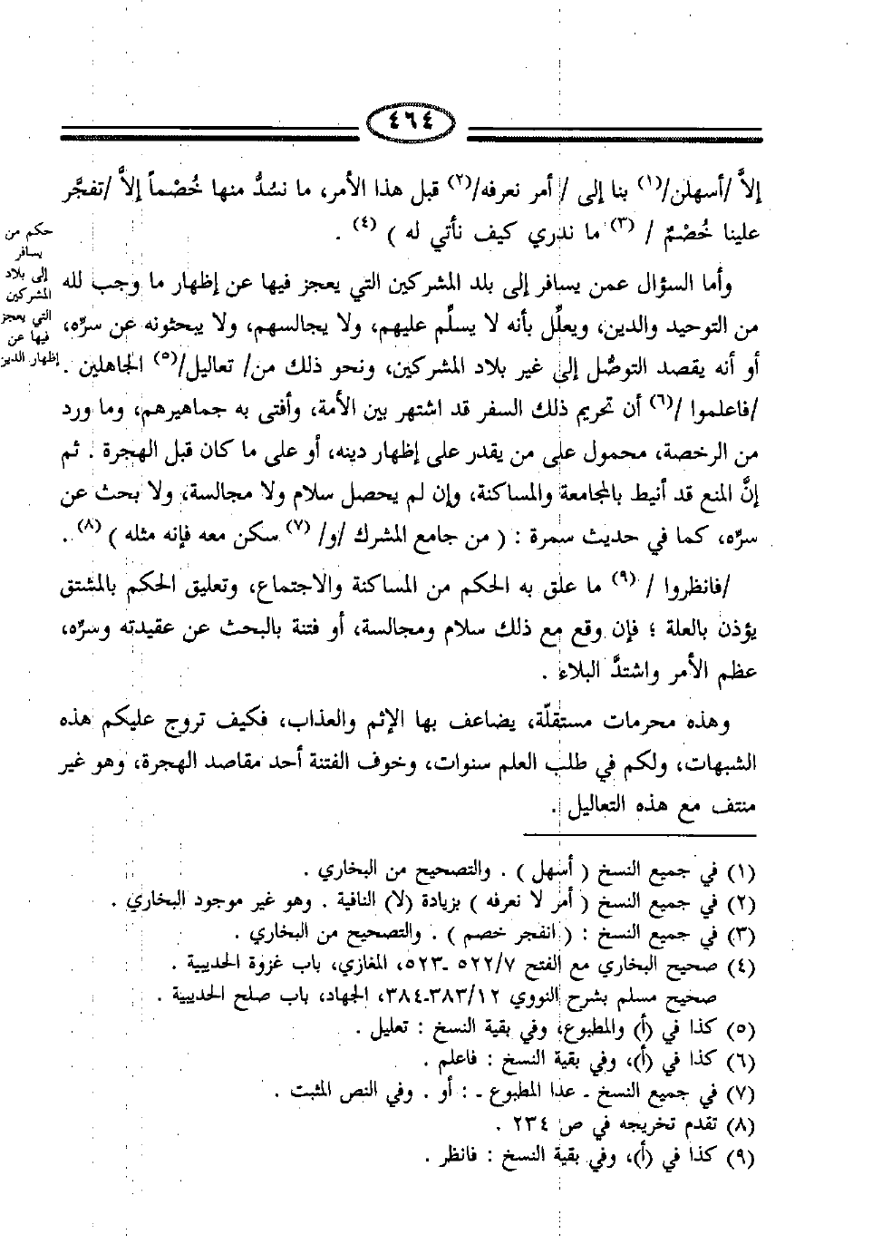 وأما السؤال عمن سافر إلى بلد المشركين التي يعجز فيها عن إظهار ما وجب الله من التوحيد والدين، ويعلل بأنه لا يسلم عليهم، ولا يجالسهم، ولا يبحثونه عن سره، أو أنه يقصد التوصل إلى غير بلاد المشركين، نحو ذلك من /تعاليل/5 الجاهلين. /فاعلموا/6 أن تحريم ذلك السفر قد اشتهر بين الأمة، وافتى به جماهيرهم، وما ورد من الرخصة، محمول على من يقدر على إظهار دينه، أو على ما كان قبل الهجرة. ثم إن المنع قد أنيط بالمجامعة والمساكنة، وإن لم يحصل سلام ولا مجالسة، ولا بحث عن سره، كما في حديث سمرة: "من جامع المشرك /و/7 سكن معه فإنه مثله" 8.
