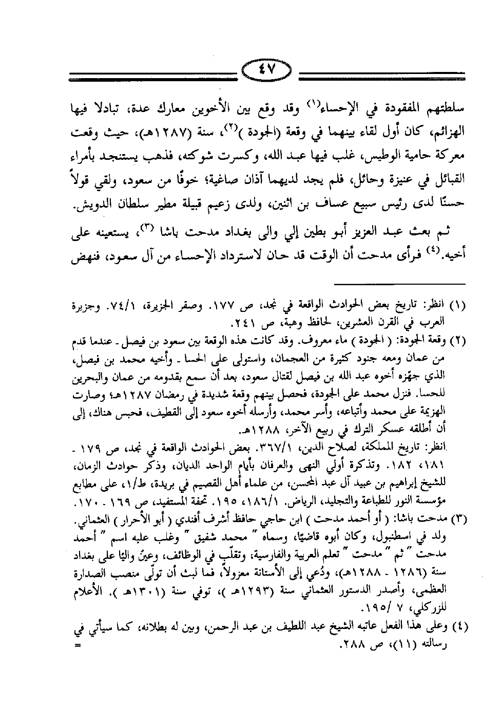 سلطتهم المفقودة في الإحساء (1) وقد وقع بين الأخوين معارك عدة، تبادلا فيها الهزائم، كان أول لقاء بينهما في وقعة (الجودة) (2) سنة (1287هـ) ، حيث وقعت معركة حامية الوطيس، غلب فيها عبد الله، وكسرت شوكته، فذهب يستنجد بأمراء القبائل في عنيزة وحائل، فلم يجد لديهما آذان صاغية؛ خوفاً من سعود، ولقي قولاً حسناً لدى رئيس سبيع عساف بن اثنين، ولدى زعيم قبيلة مطير سلطان الدويش.