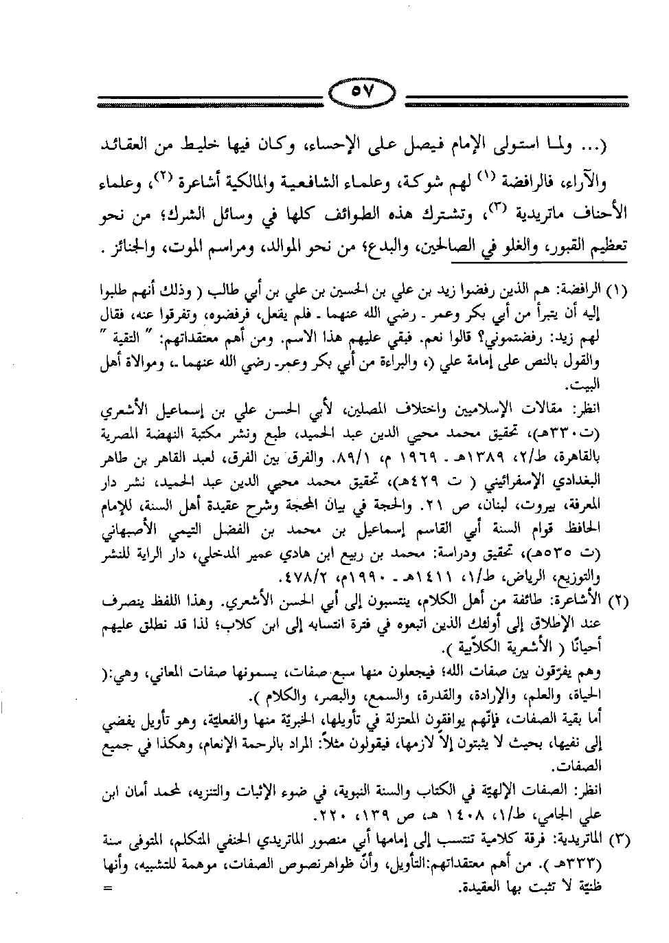 ( ... ولما استولى الإمام فيصل على الإحساء، وكان فيها خليط من العقائد والآراء، فالرافضة (1) لهم شوكة، وعلماء الشافعية والمالكية أشاعرة (2) ، وعلماء الأحناف ماتريدية (3) ، وتشترك هذه الطوائف كلها في وسائل الشرك؛ من نحو تعظيم القبور، والغلو في الصالحين، والبدع؛ من نحو الموالد، ومراسم الموت، والجنائز.