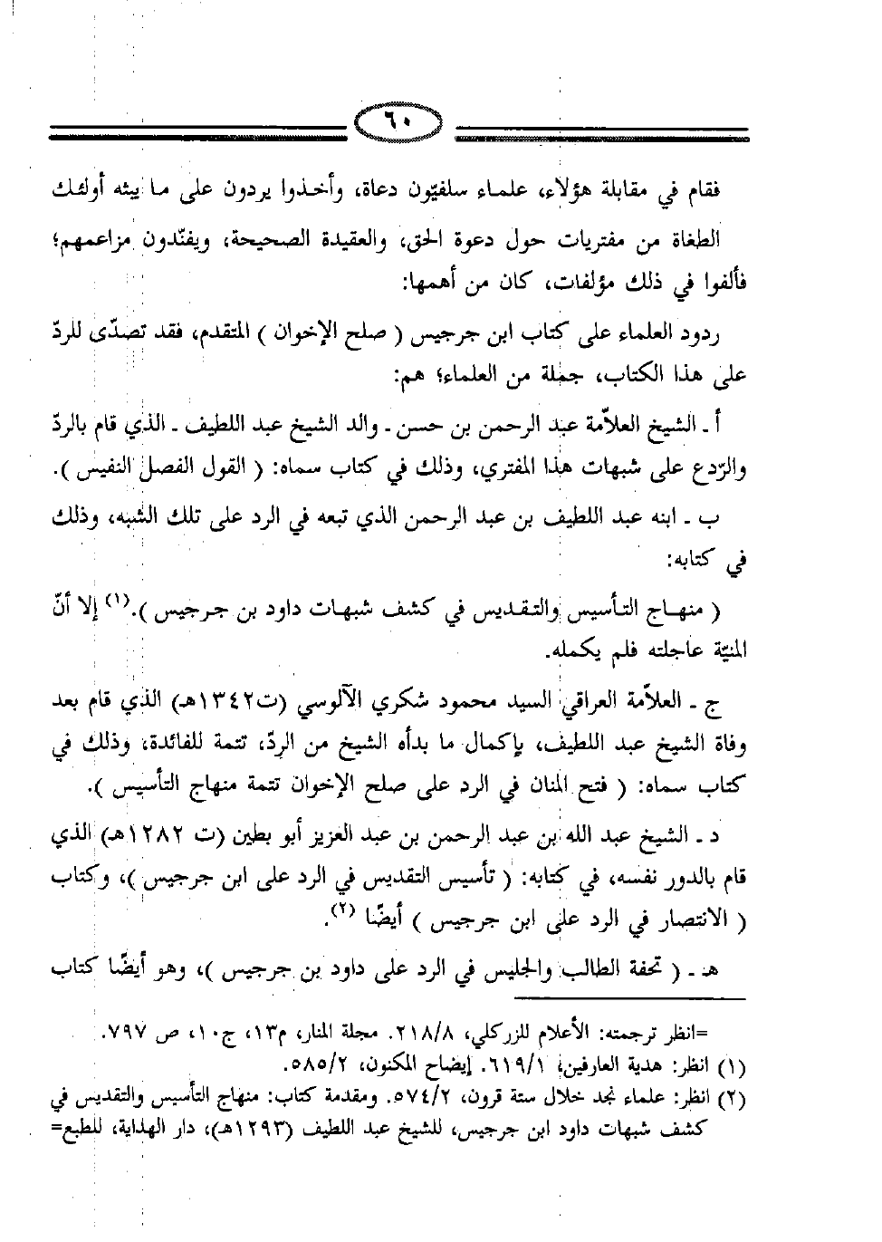 (2) انظر: علماء نجد خلال ستة قرون، 2/574. ومقدمة كتاب: منهاج التأسيس والتقديس في كشف شبهات داود بن جرجيس، للشيخ عبد اللطيف (1293هـ) ، دار الهداية، للطبع والنشر والترجمة، الرياض، ص/2، 1407هـ-1987م. ص5.