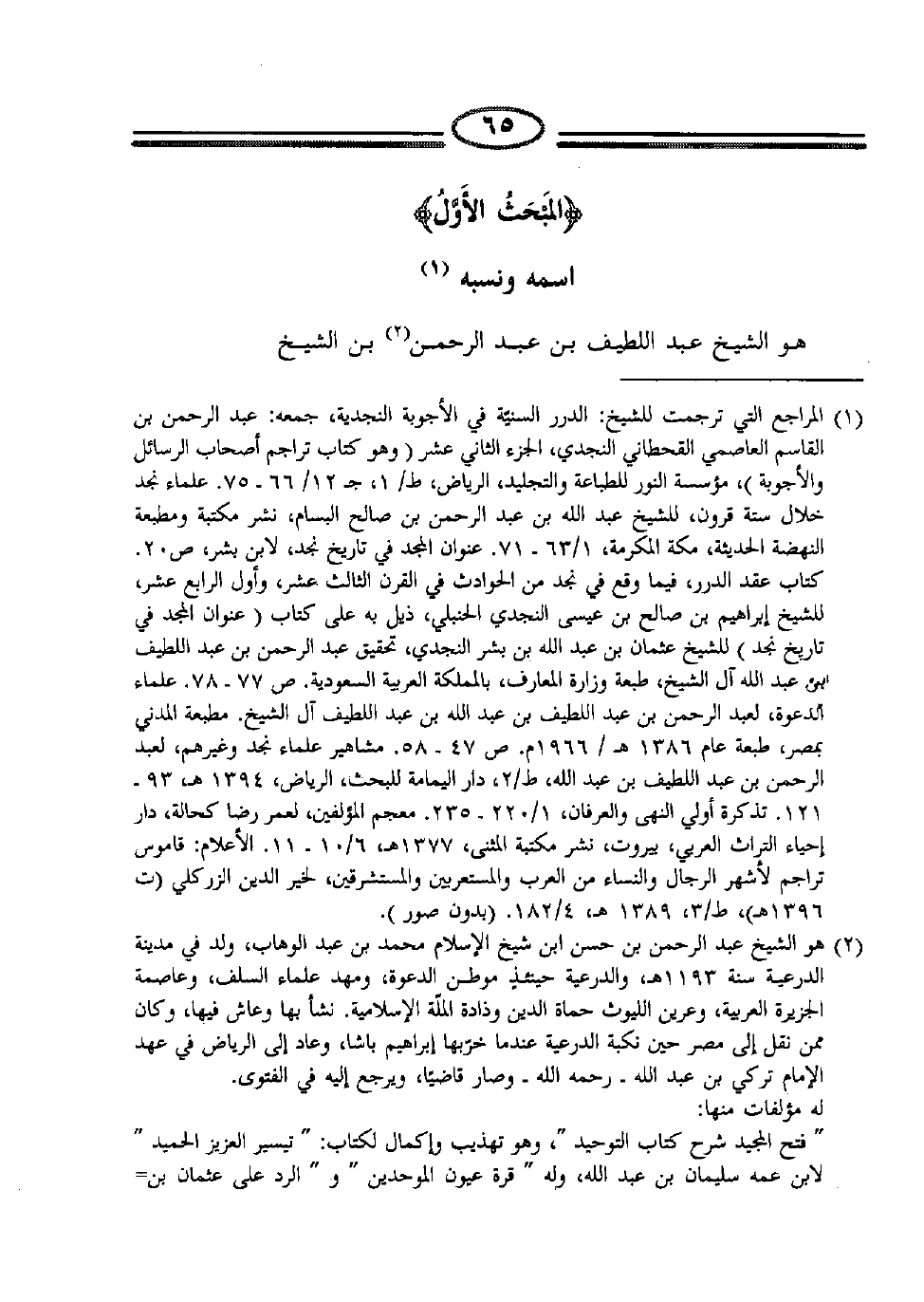 (2) هو الشيخ عبد الرحمن بن حسن بن شيخ الإسلام محمد بن عبد الوهاب، ولد في مدينة الدرعية سنة 1193هـ، والدرعية حينئذٍ موطن الدعوة، ومهد علماء السلف، وعاصمة الجزيرة العربية، وعرين الليوث حماة الدين وذاذة الملة الإسلامية. نشأ بها وعاش فيها، وكان ممن نقل إلى مصر حين نكبة الدرعية عندما خرّبها إبراهيم باشا، وعاد إلى الرياض في عهد الإمام تركي بن عبد الله -رحمه الله- وصار قاضياً، ويرجع إليه في الفتوى.