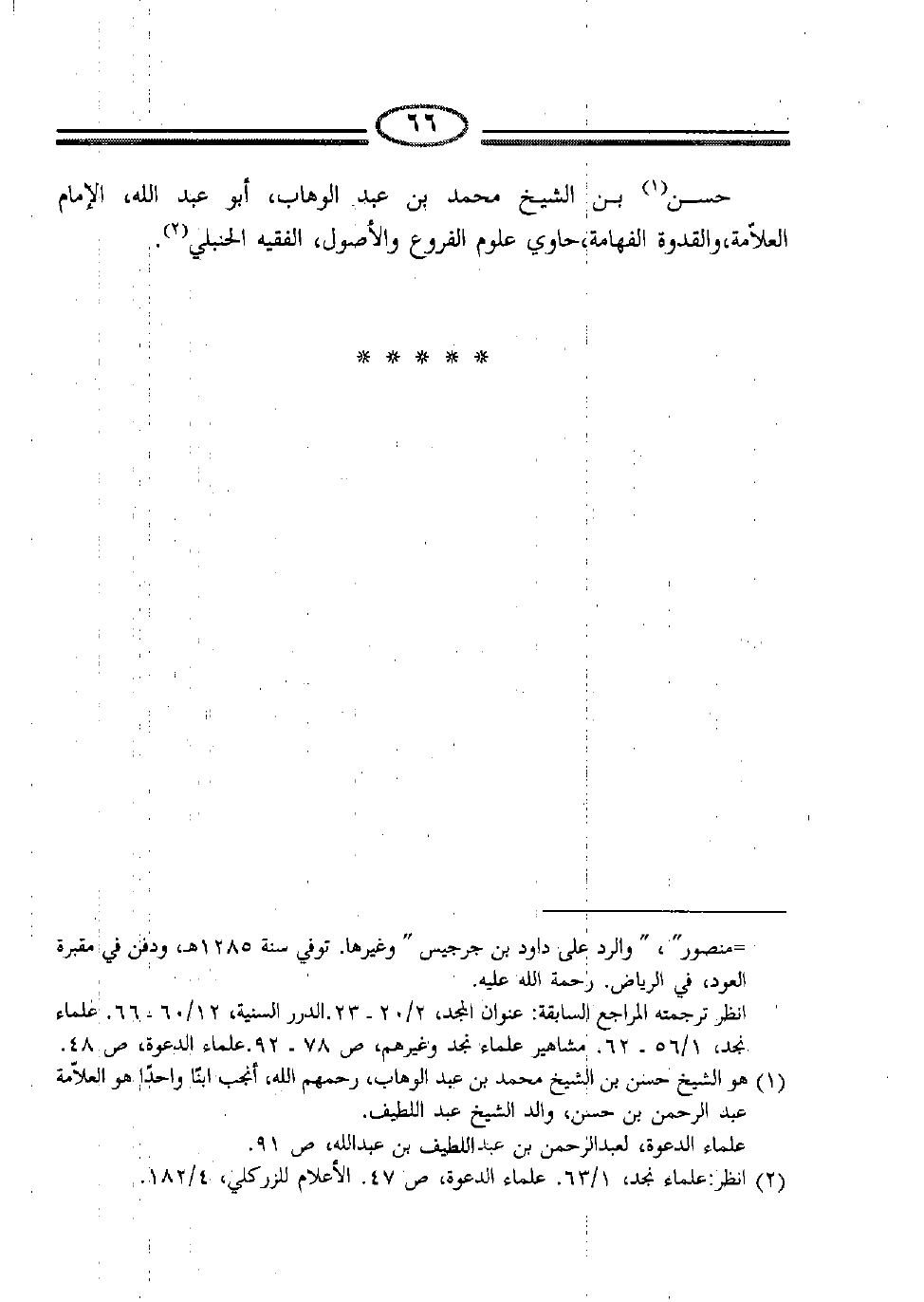 (1) هو الشيخ حسن بن الشيخ محمد بن عبد الوهاب، رحمهم الله، أنجب ابناً واحداً هو العلامة عبد الرحمن بن حسن، والد الشيخ عبد اللطيف.