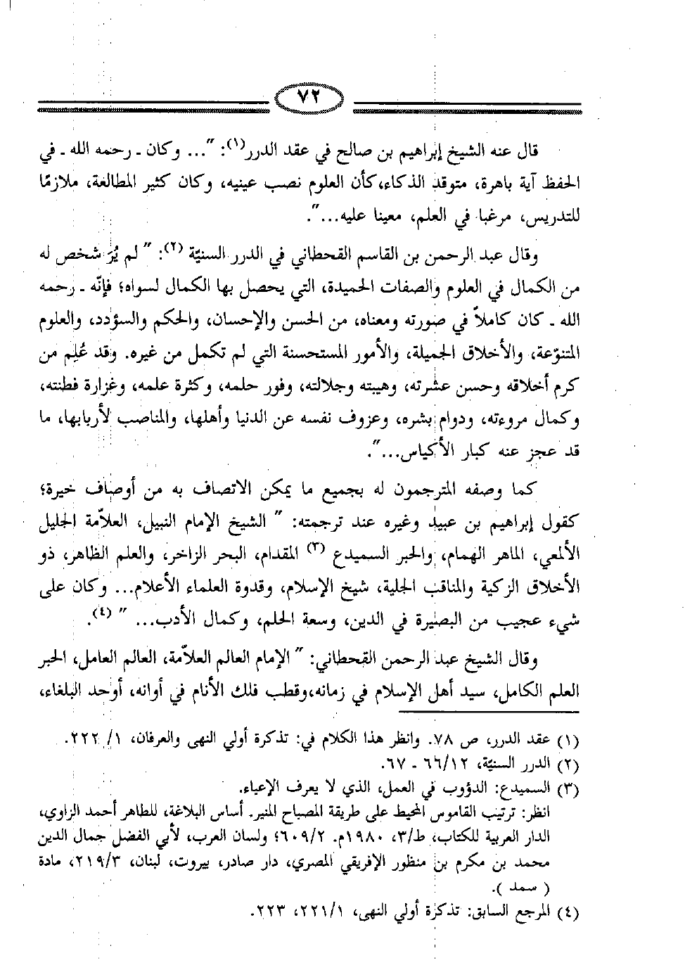 وقال عبد الرحمن بن القاسم القحطاني في الدرر السنية (2) : "لم يُر شخص له من الكمال في العلوم والصفات الحميدة، التي يحصل بها الكمال لسواه؛ فإنه -رحمه الله-كان كاملاً في صورته ومعناه، من الحسن والإحسان، والحكم والسؤدد، والعلوم المتنوعة، والأخلاق الجميلة، والأمور المستحسنة التي لم تكمل من غيره. وقد عُلم من كرم أخلاقه وحسن عشرته، وهيبته وجلالته، وفور حلمه، وكثرة علمه، وغزارة فطنته، وكمال مروءته، ودوام بشره، وعزوف نفسه عن الدنيا وأهلها، والمناصب لأربابها، ما قد عجز عنه كبار الأكياس ... ".