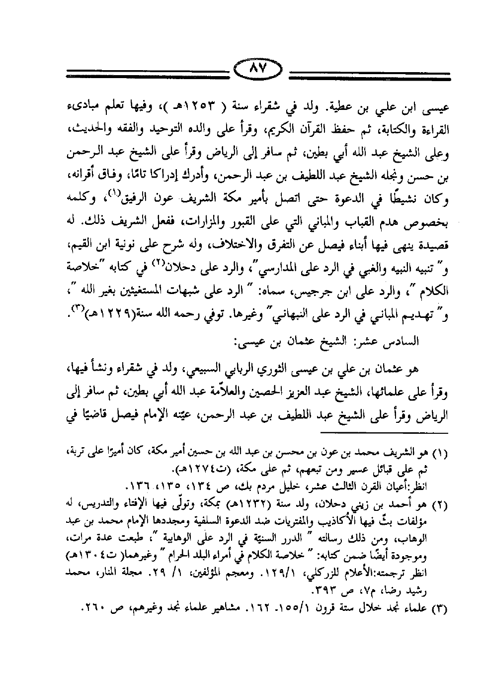 (2) هو أحمد بن زيني دحلان، ولد سنة (1232هـ) ، وتولى فيها الإفتاء والتدريس، له مؤلفات، بث فيها الأكاذيب والمفتريات ضد الدعوة السلفية ومجددها الإمام محمد بن عبد الوهاب، ومن ذلك رسالته "الدرر السنية في الرد على الوهابية"، طبعت عدة مرات وموجودة أيضاً ضمن كتابه: "خلاصة الكلام في أمراء البلد الحرام" وغيرهما (ت 1304هـ) .