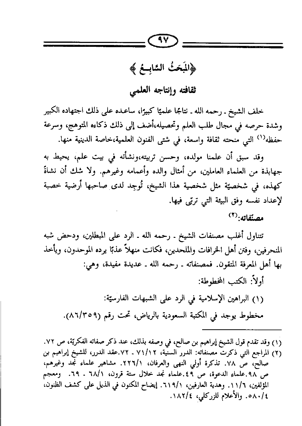 (2) المراجع التي ذكرت مصنفاته: الدرر السنية، 12/71-72. عقد الدرر، للشيخ إبراهيم بن صالح، ص78. تذكرة أولي النهى والعرفان، 1/266. مشاهير علماء نجد وغيرهم، ص98. علماء الدعوة، ص498. علماء نجد خلال ستة قرون، 1/68-69. ومعجم المؤلفين، 6/11. وهدية العارفين، 1/619. إيضاح المكنون في الذيل على كشف الظنون، 4/580. والأعلام للزركلي، 4/182.