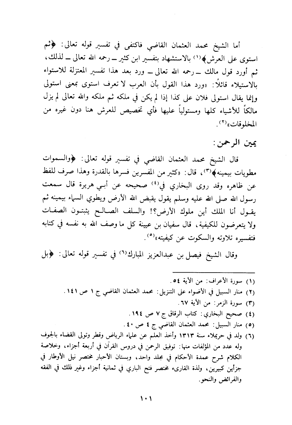قال الشيخ محمد العثمان القاضي في تفسير قوله تعالى: {وَالسَّمَاوَاتُ مَطْوِيَّاتٌ بِيَمِينِهِ} 3، قال: "كثير من المفسرين فسرها بالقدرة, وهذا صرف للفظ عن ظاهره, وقد روى البخاري في4 صحيحه عن أبي هريرة قال: سمعت رسول الله -صلى الله عليه وسلم- يقول: "يقبض الله الارض ويطوي السماء بيمينه ثم يقول: أنا الملك, أين ملوك الأرض؟ " والسلف الصالح يثبتون الصفات ولا يتعرضون للكيفية، قال سفيان بن عيينة: كل ما وصف الله به نفسه في كتابه, فتفسيره تلاوته والسكوت عن كيفيته"5.