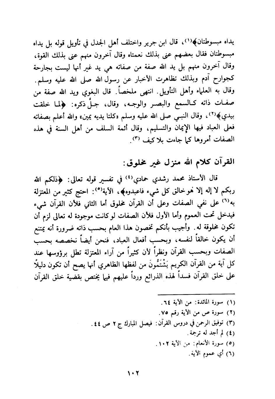 قال الأستاذ محمد رشدي حمادي4 في تفسير قوله تعالى: {ذَلِكُمُ اللَّهُ رَبُّكُمْ لا إِلَهَ إِلَّا هُوَ خَالِقُ كُلِّ شَيْءٍ فَاعْبُدُوه} الآية5: احتج كثير من المعتزلة به6 على نفي الصفات وعلى أن القرآن مخلوق أما الثاني فلأن القرآن شيء فيدخل تحت العموم وأما الأول فلأن الصفات لو كانت موجودة له تعالى للزم أن تكون مخلوقة له. وأجيب بأنكم تخصون هذا العام بحسب ذاته ضرورة أنه يمتنع أن يكون خالقا لنفسه، وبحسب أفعال العباد، فنحن أيضا نخصصه بحسب الصفات وبحسب القرآن ونظرا لأن كثيرا من آراء المعتزلة تطل برءوسها عند كل آية من القرآن الكريم يشتمّون من لفظها الظاهري أنها يصح أن تكون دليلا على خلق القرآن, فسدا لهذه الذرائع وردا عليهم فيما يختص بقضية خلق القرآن